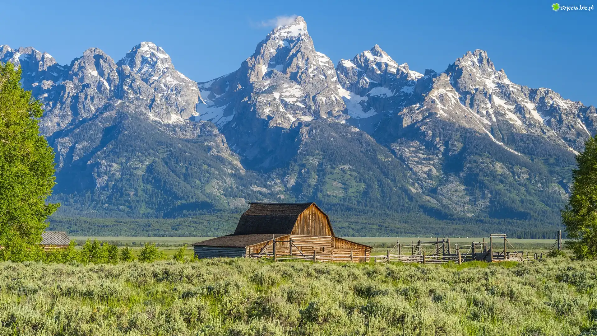 Zdjęcie Drewniana, Chata, Stodoła, Góry, Teton Range, Drzewa, Chmury, Park Narodowy Grand Teton, Stan Wyoming, Stany Zjednoczone |