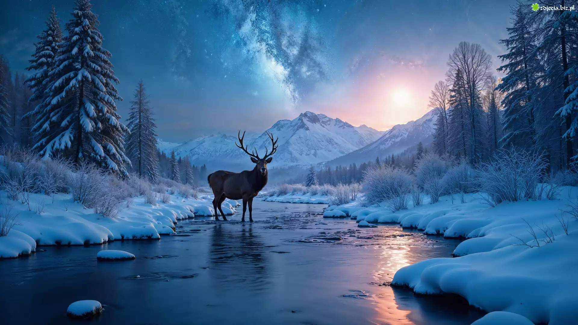 Zdjęcie Zima, Noc, Rzeka, Jeleń, Śnieg, Góry, Drzewa, Niebo, Gwiazdy, Droga Mleczna