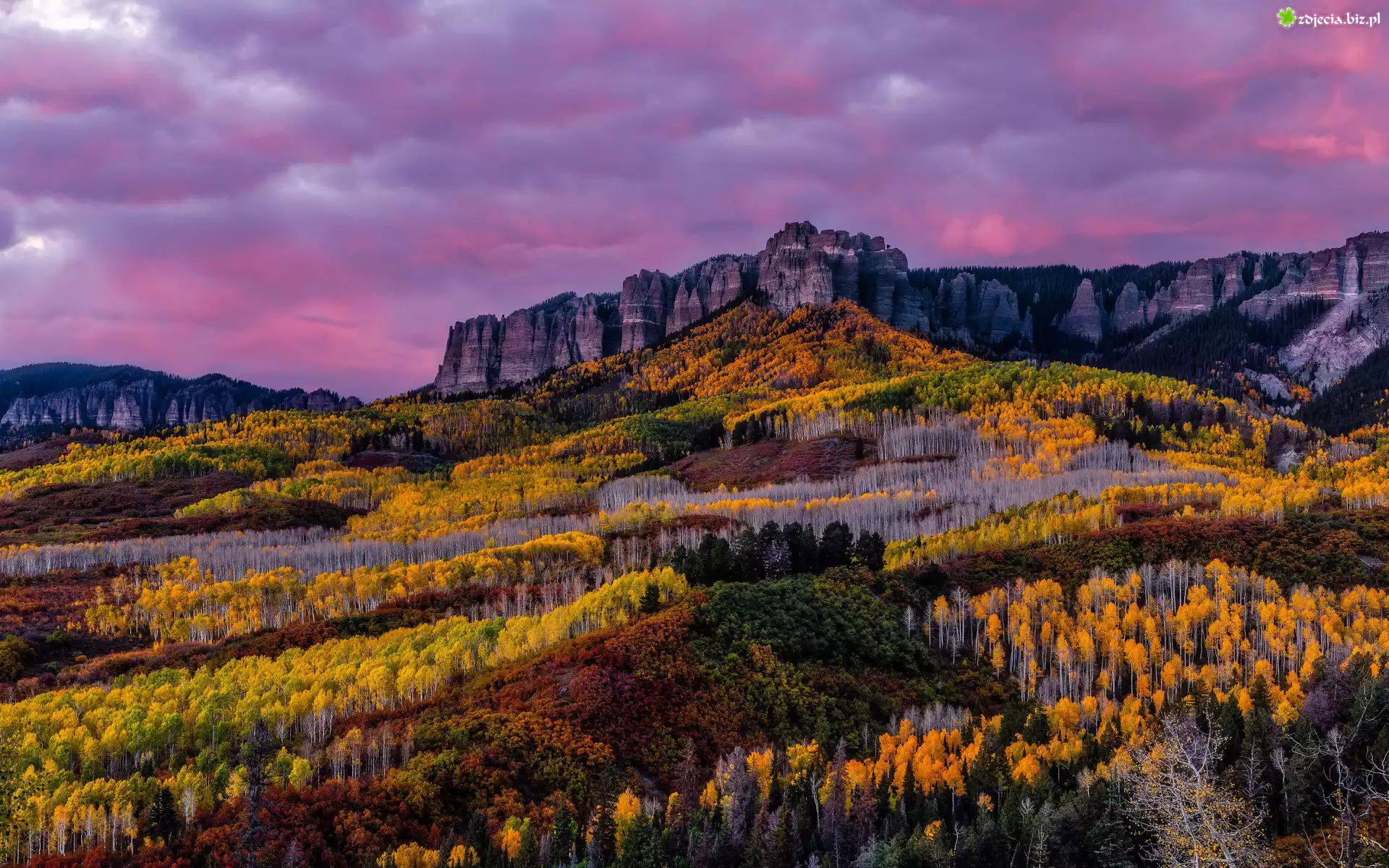 Zdjęcie Stany Zjednoczone, Kolorado, San Juan Mountains, Jesień, Góry, Skały, Drzewa, Las, Niebo |