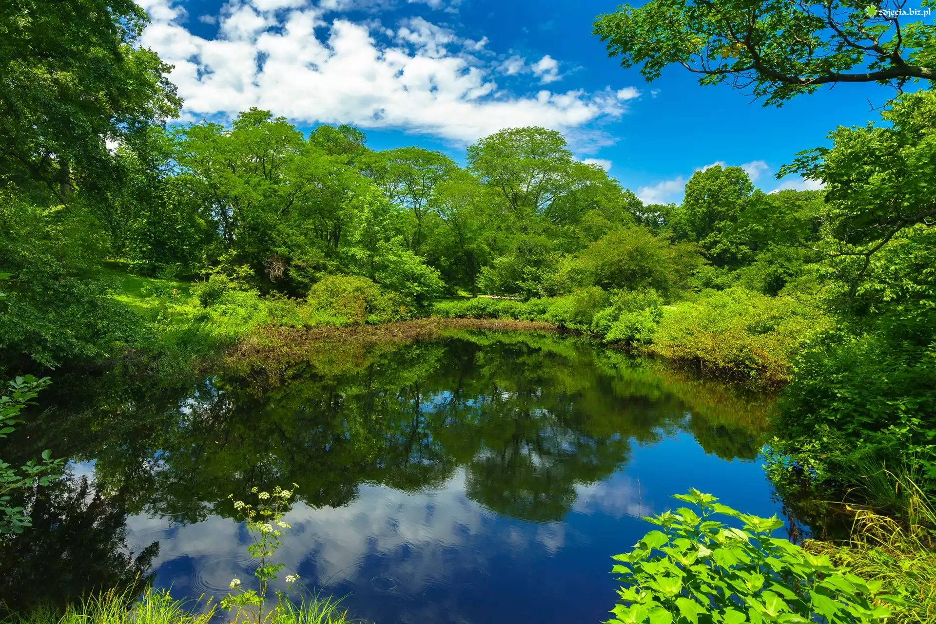 Zdjęcie Drzewa, Zieleń, Staw, Odbicie, Niebo, Lato