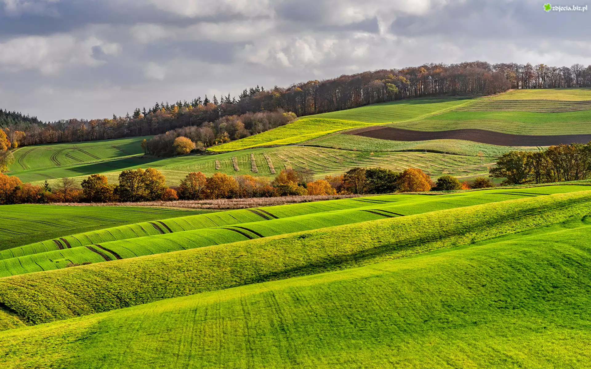 Zdjęcie Wzgórza, Pola, Uprawne, Drzewa, Las, Niebo