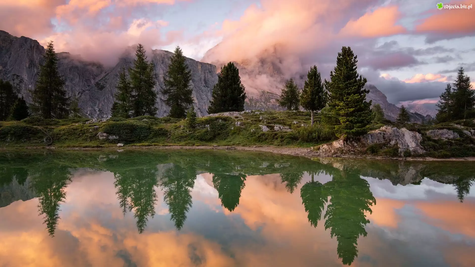 Zdjęcie Góry, Jezioro, Chmury, Drzewa, Skały, Odbicie