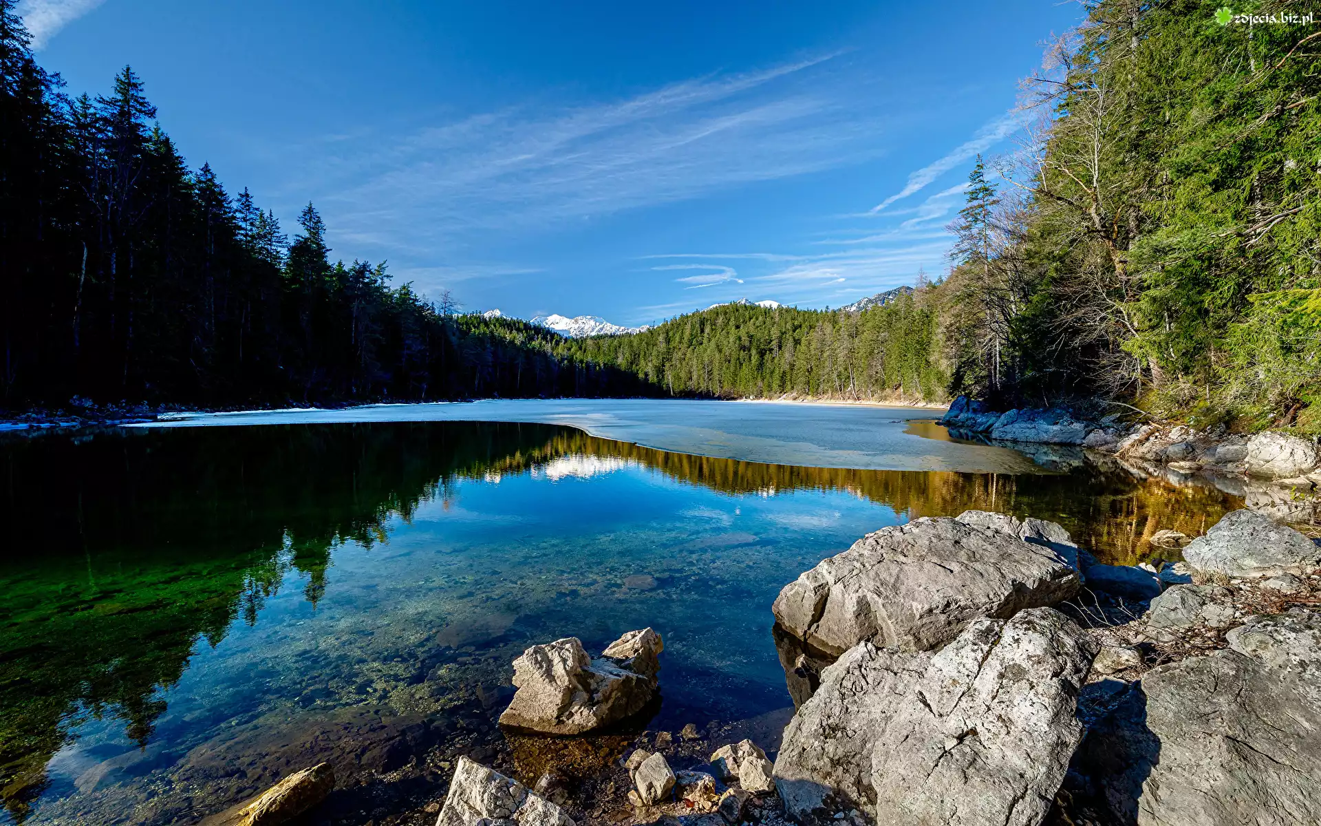 Zdjęcie Góry, Rzeka, Las, Drzewa, Kamienie, Odbicie