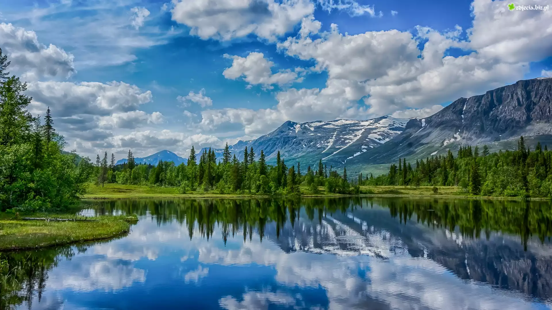 Zdjęcie Góry, Jezioro, Lasy, Drzewa, Chmury, Odbicie