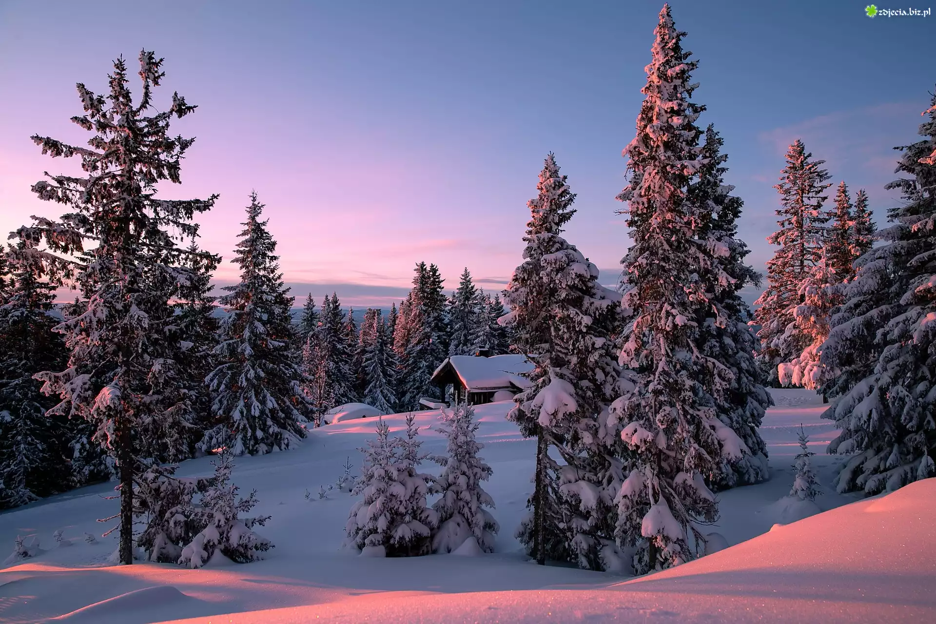 Zdjęcie Drzewa, Wzgórza, Dom, Zima, Ośnieżone, Świerki