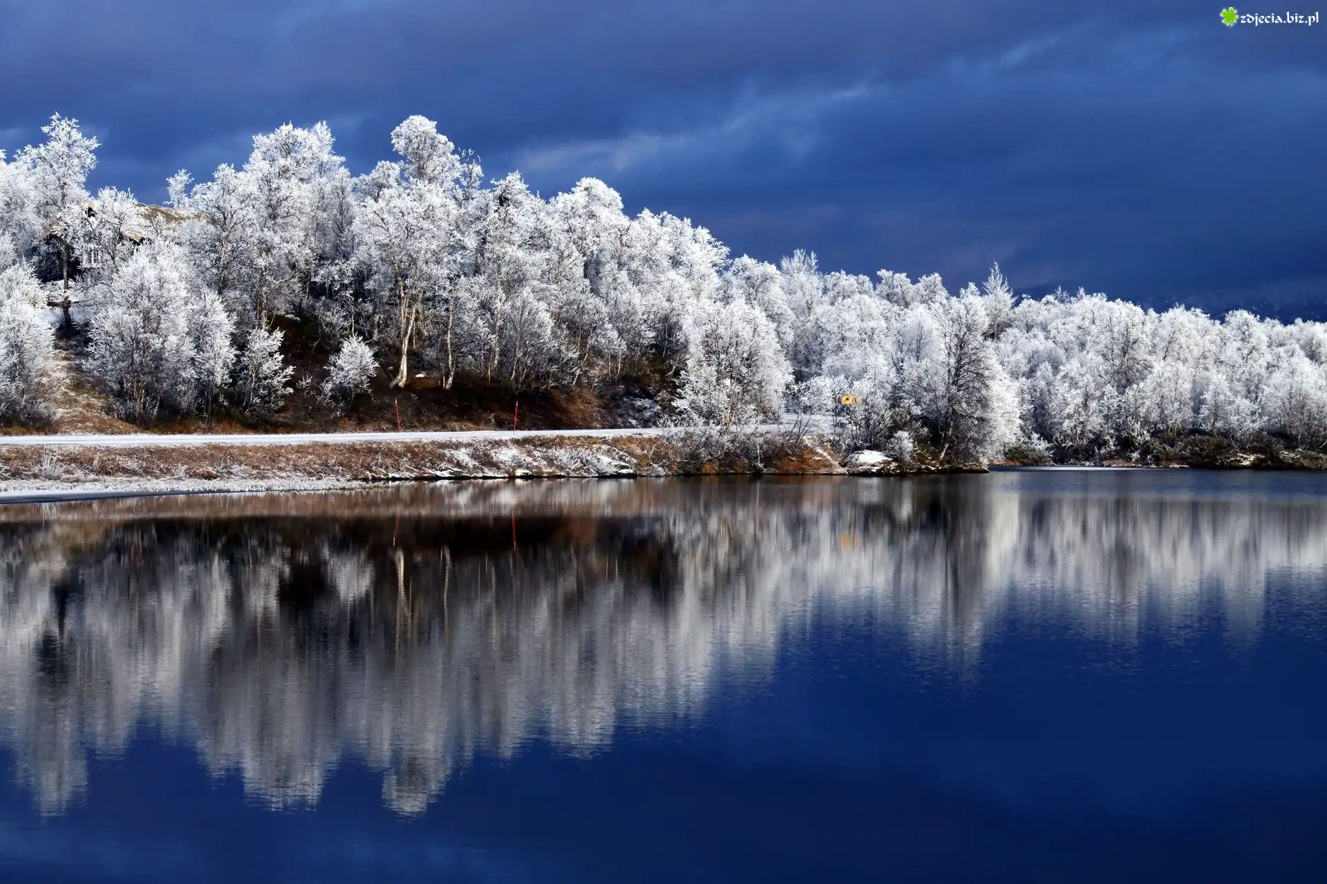 Zdjęcie, Oszronione, Drzewa, Jezioro