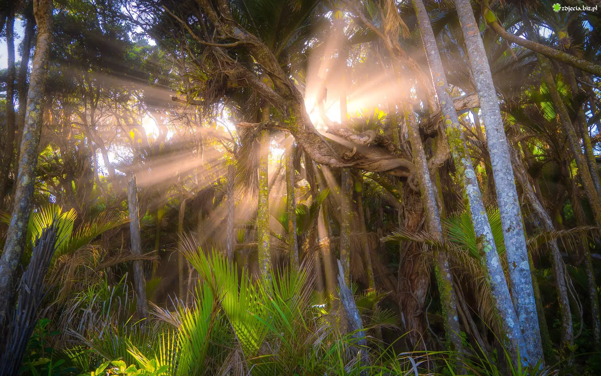 Zdjęcie Las, Drzewa, Palmy, Przebijające światło