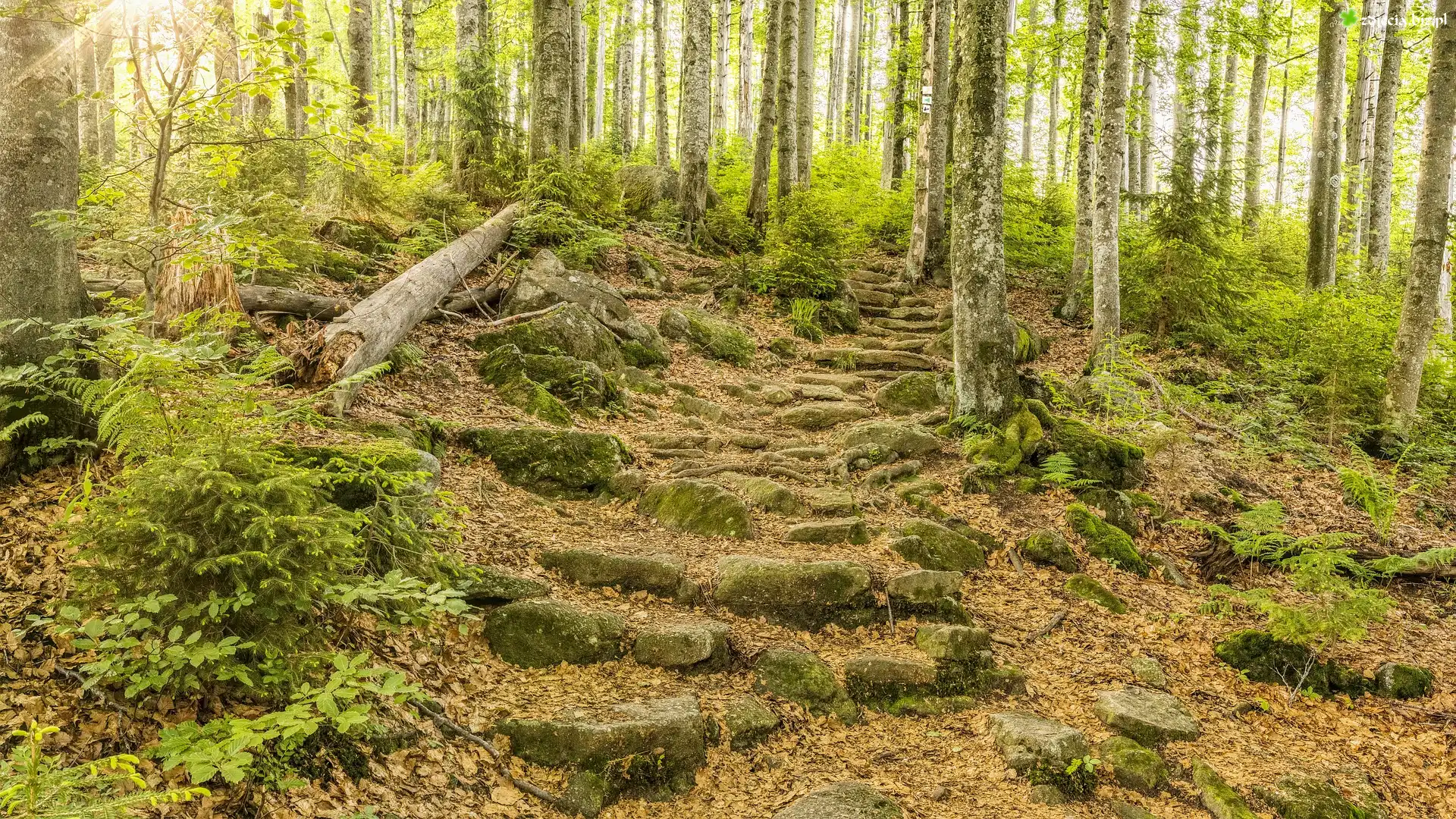 Zdjęcie Drzewa, Szlak, Kamienie, Paprocie, Las