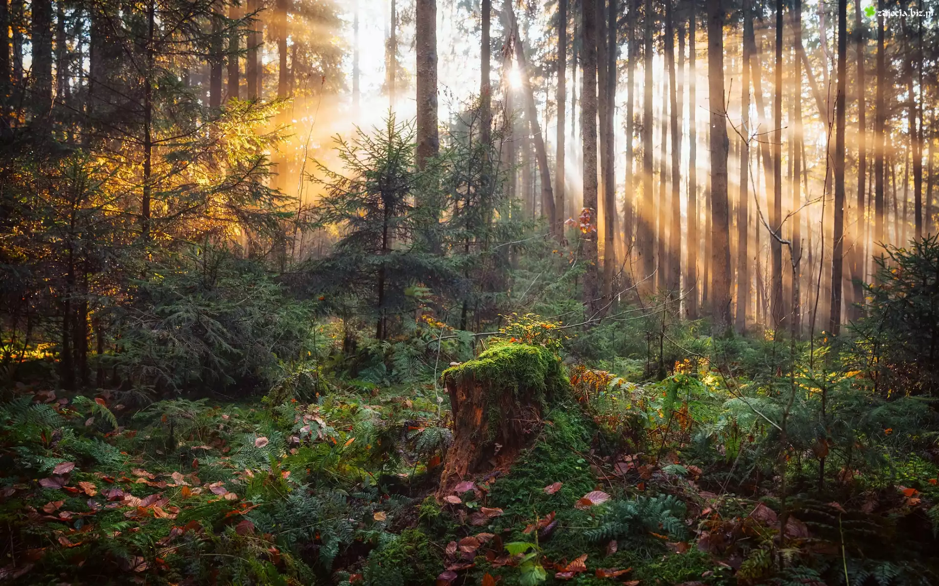 Zdjęcie Las, Drzewa, Przebijające światło, Słoneczne, Omszały, Pień, Paprocie