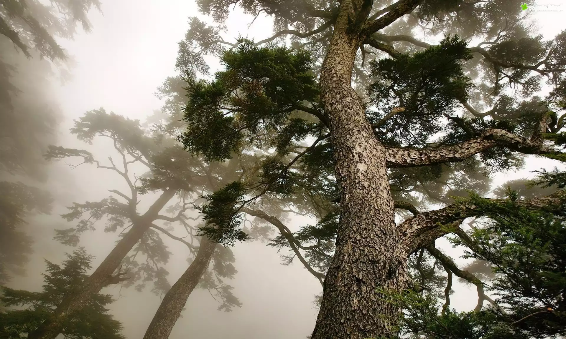 Zdjęcie, Drzewa, Sosny, Poranek, Mgła