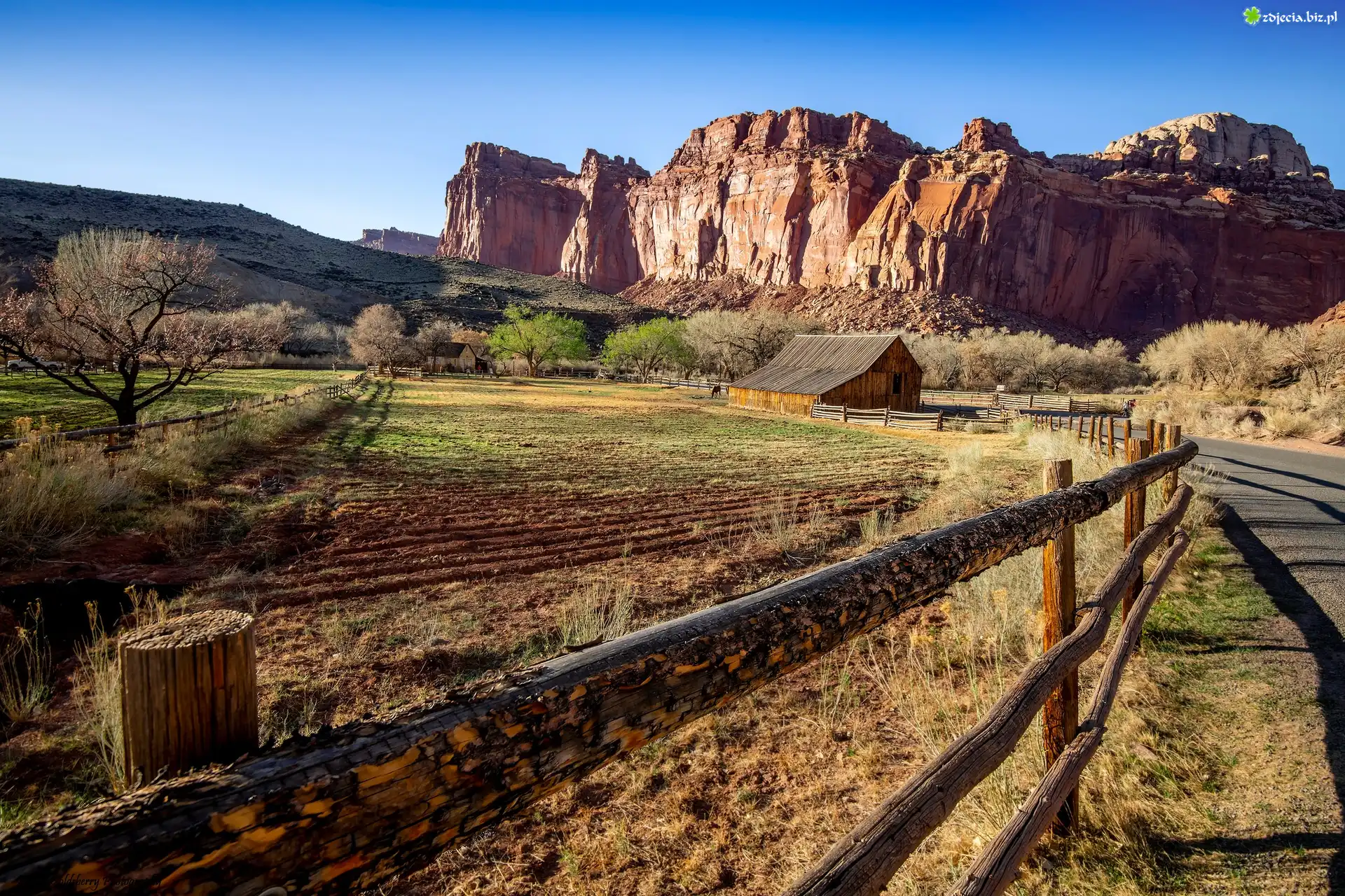 Zdjęcie Czerwone, Skały, Stodoła Gifford, Droga, Ogrodzenie, Pola, Drzewa, Park Narodowy Capitol Reef, Utah, Stany Zjednoczone |