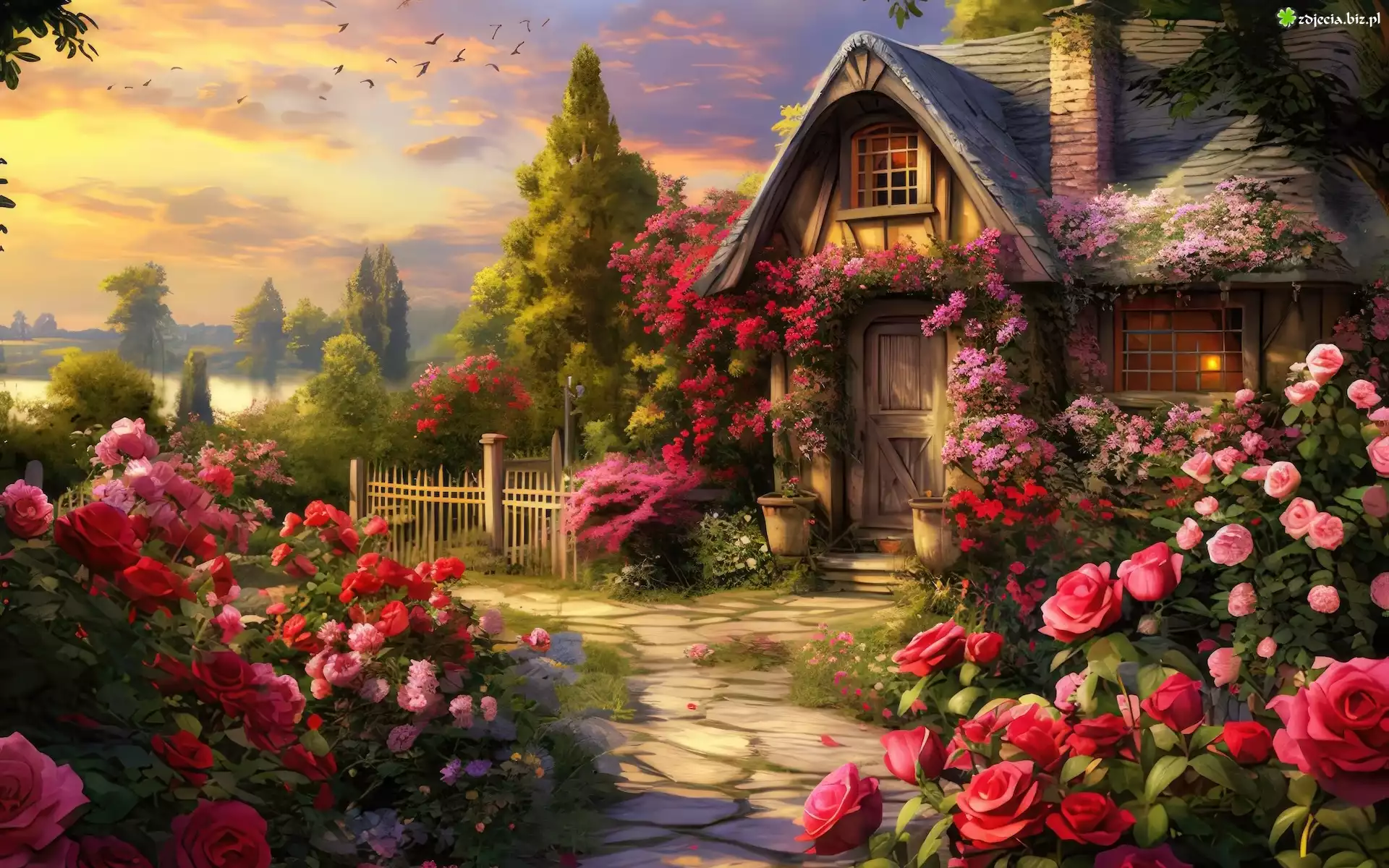 Zdjęcie Grafika, Dom, Ogród, Drzewa, Kwiaty, Róże