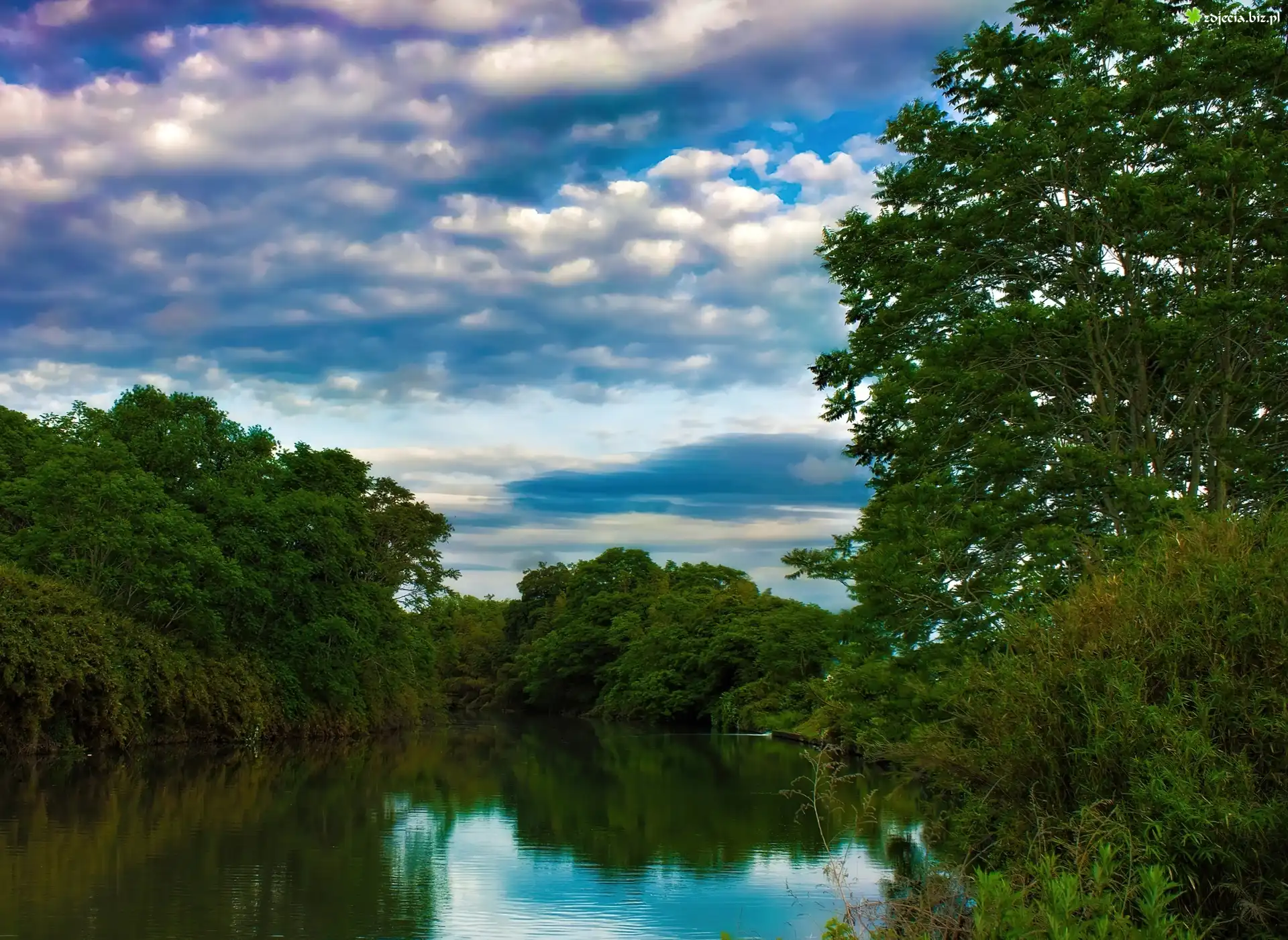 Zdjęcie, Rzeka, Drzewa, Chmury