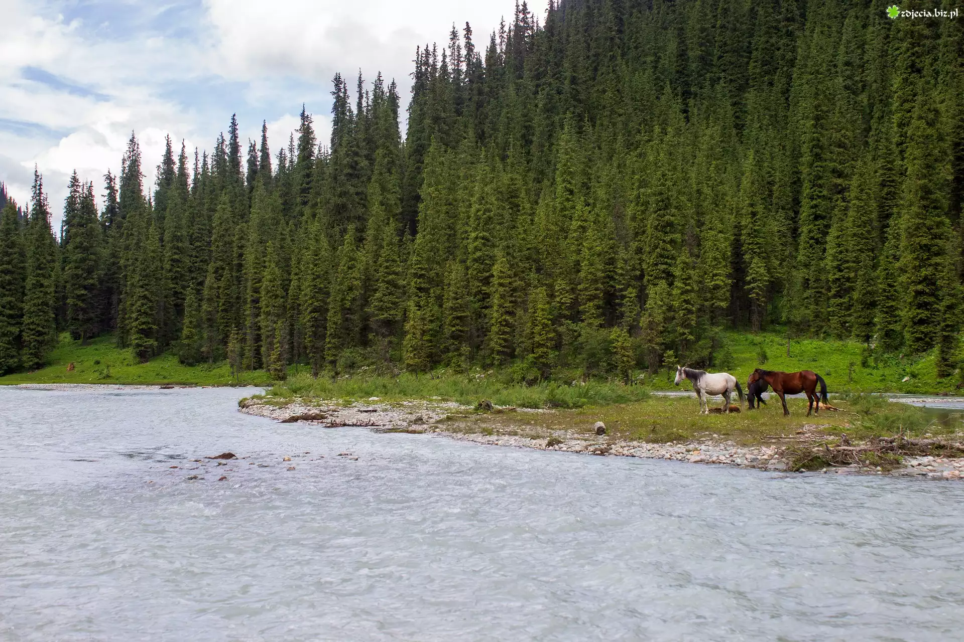 Zdjęcie, Rzeka, Las, Konie, Drzewa