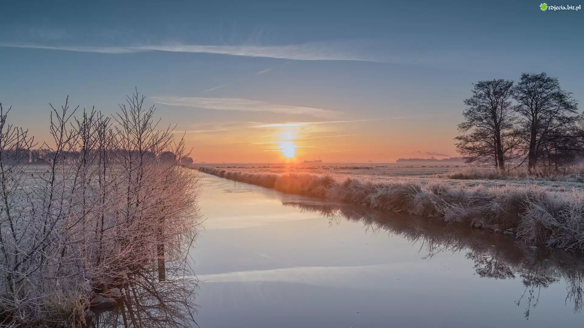 Zdjęcie Rzeka, Drzewa, Szron, Zima, Pole, Wschód słońca
