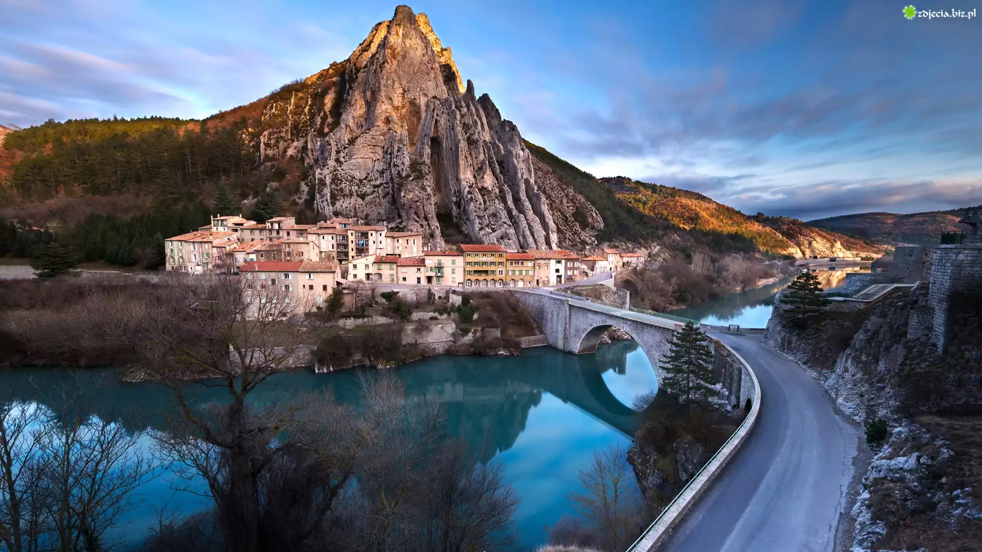 Zdjęcie Francja, Prowansja, Sisteron, Skała Sisteron, Rzeka Durance, Most, Domy, Drzewa