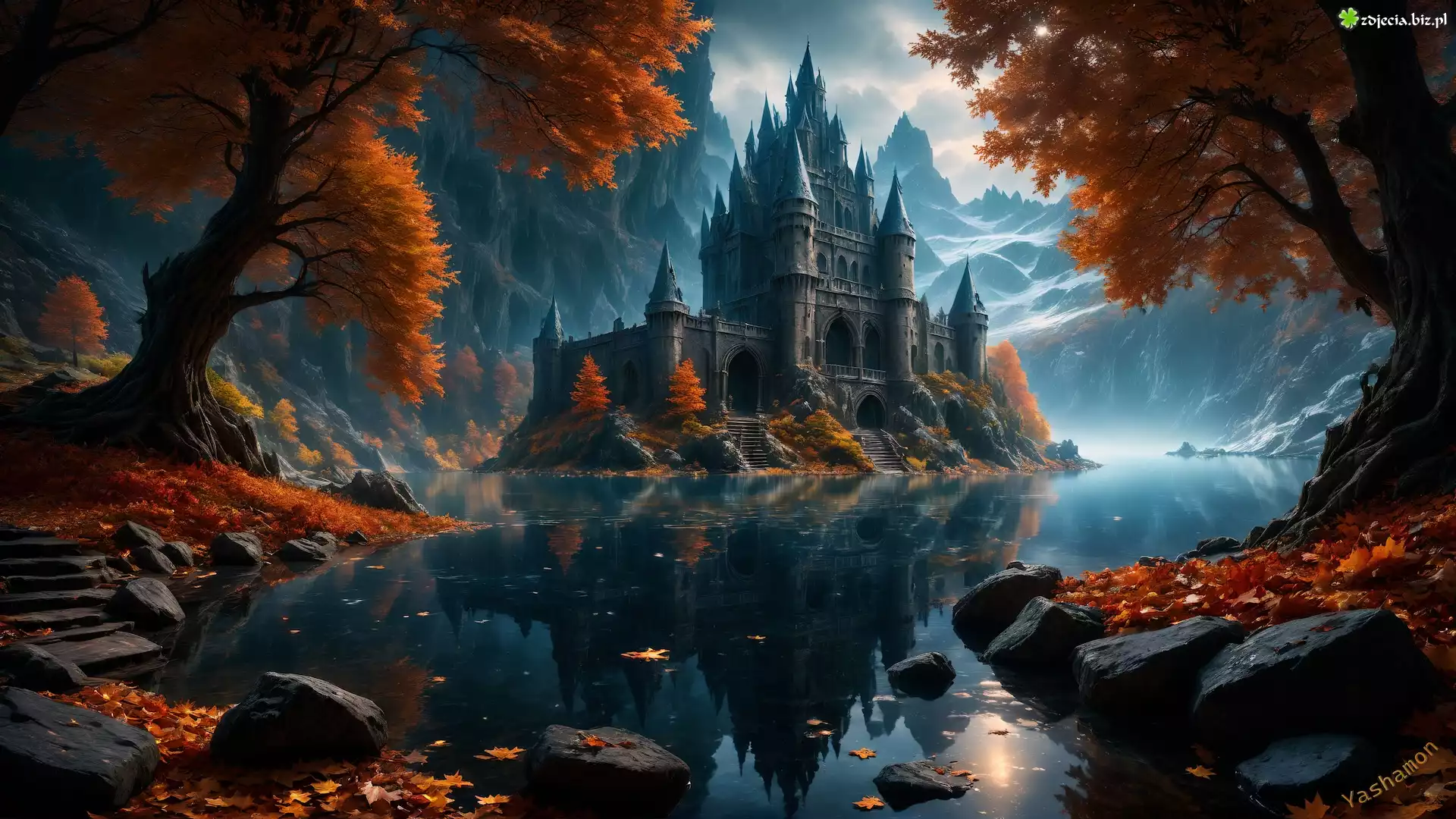 Zdjęcie Grafika, Zamek, Jesień, Drzewa, Rzeka, Skały
