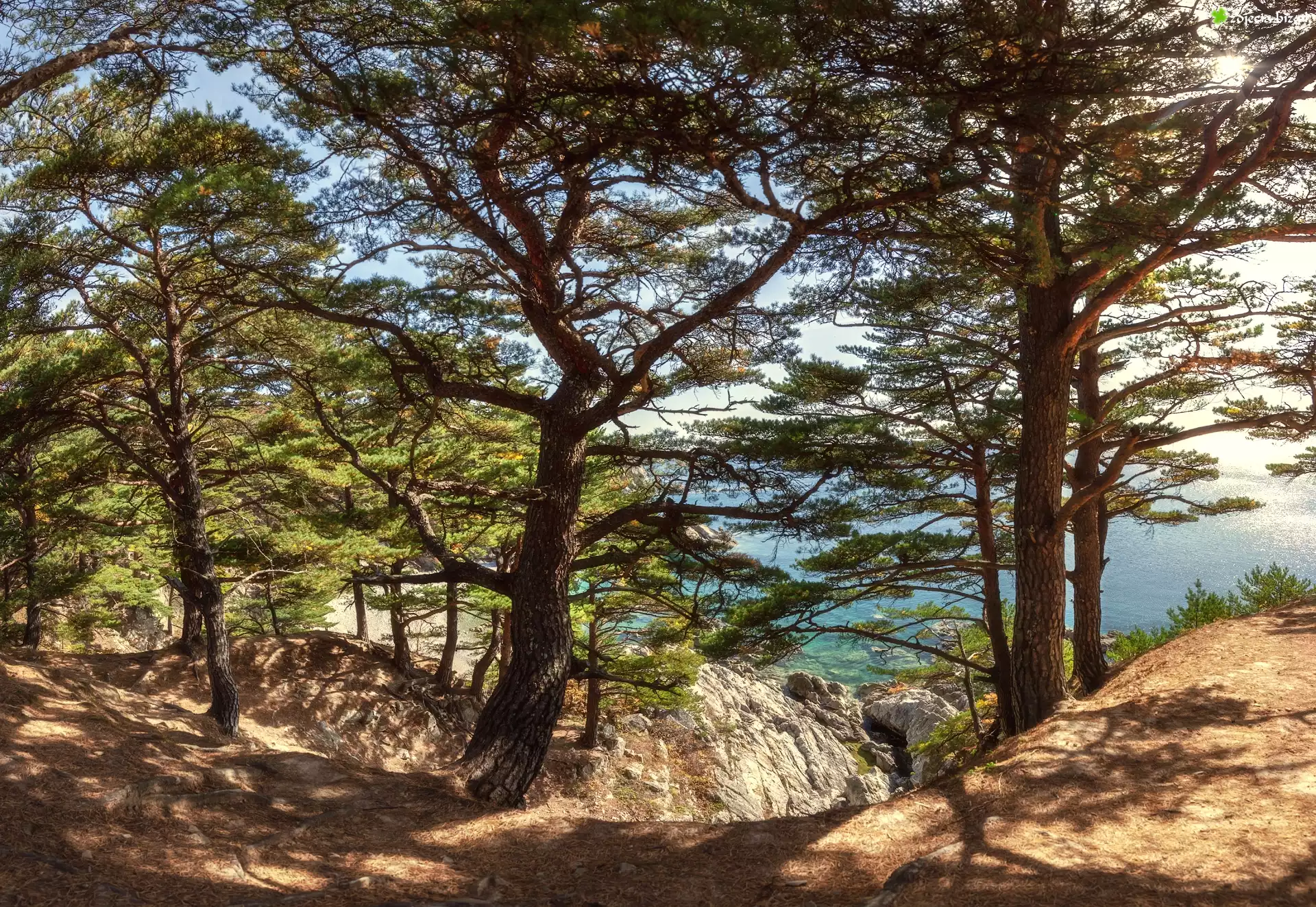 Zdjęcie Drzewa, Morze, Skały, Piasek