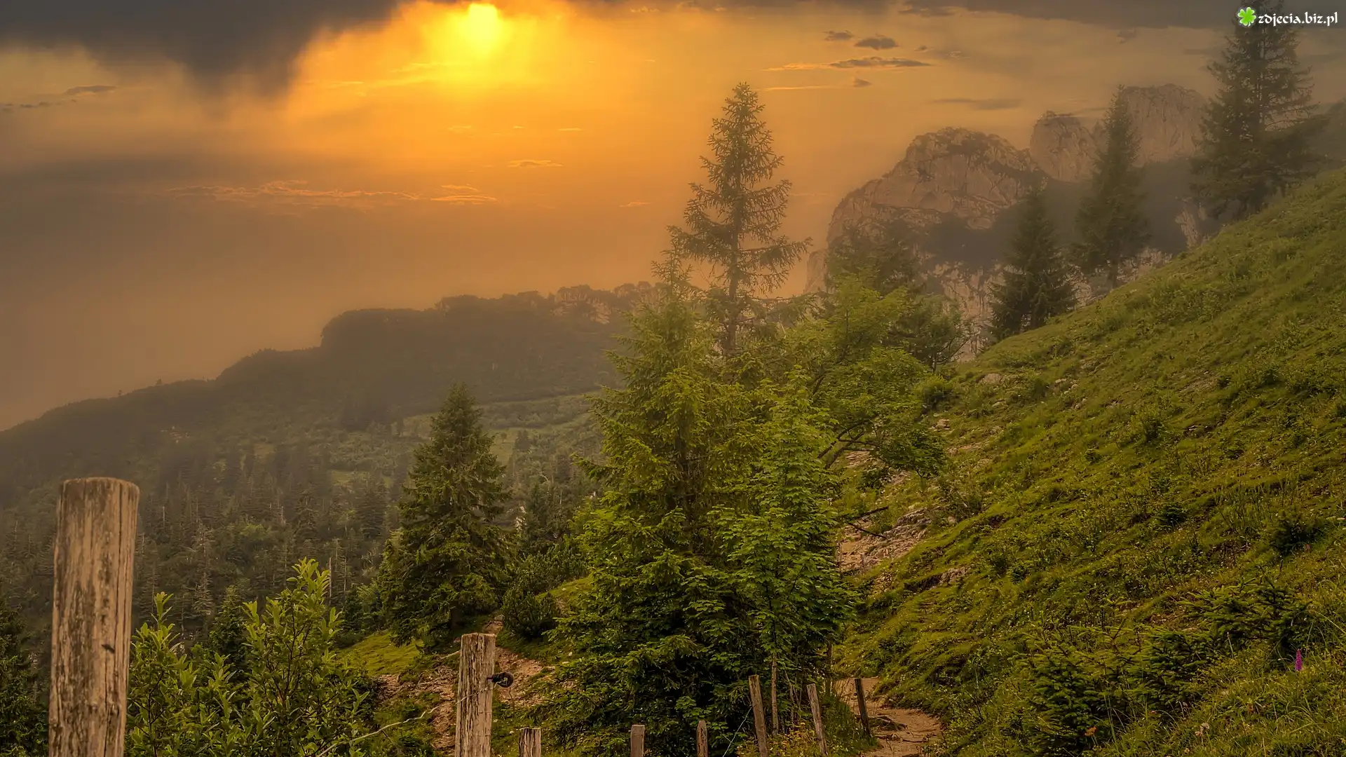 Zdjęcie Góry, Drzewa, Krzewy, Droga, Szlak, Mgła, Wschód słońca
