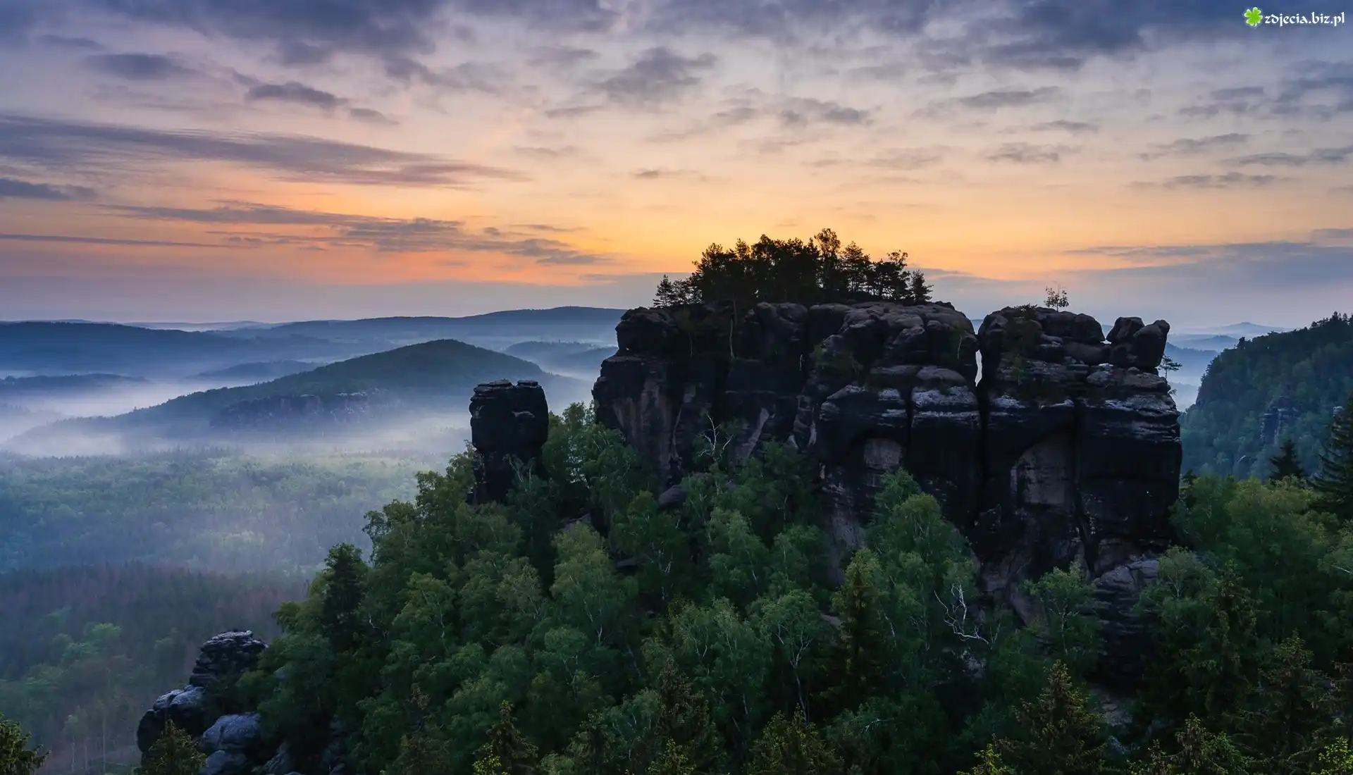 Zdjęcie Drzewa, Lasy, Mgła, Wschód słońca, Skały