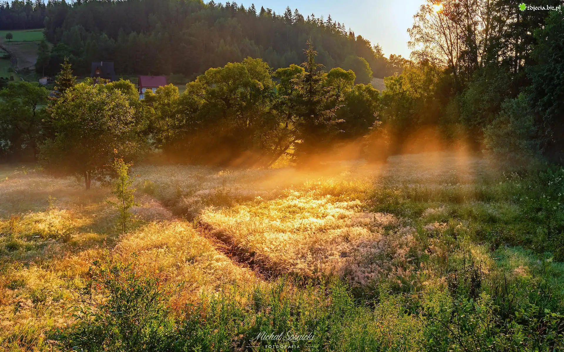 Zdjęcie Łąka, Światło, Słoneczne, Drzewa, Poranek, Mgła, Lato