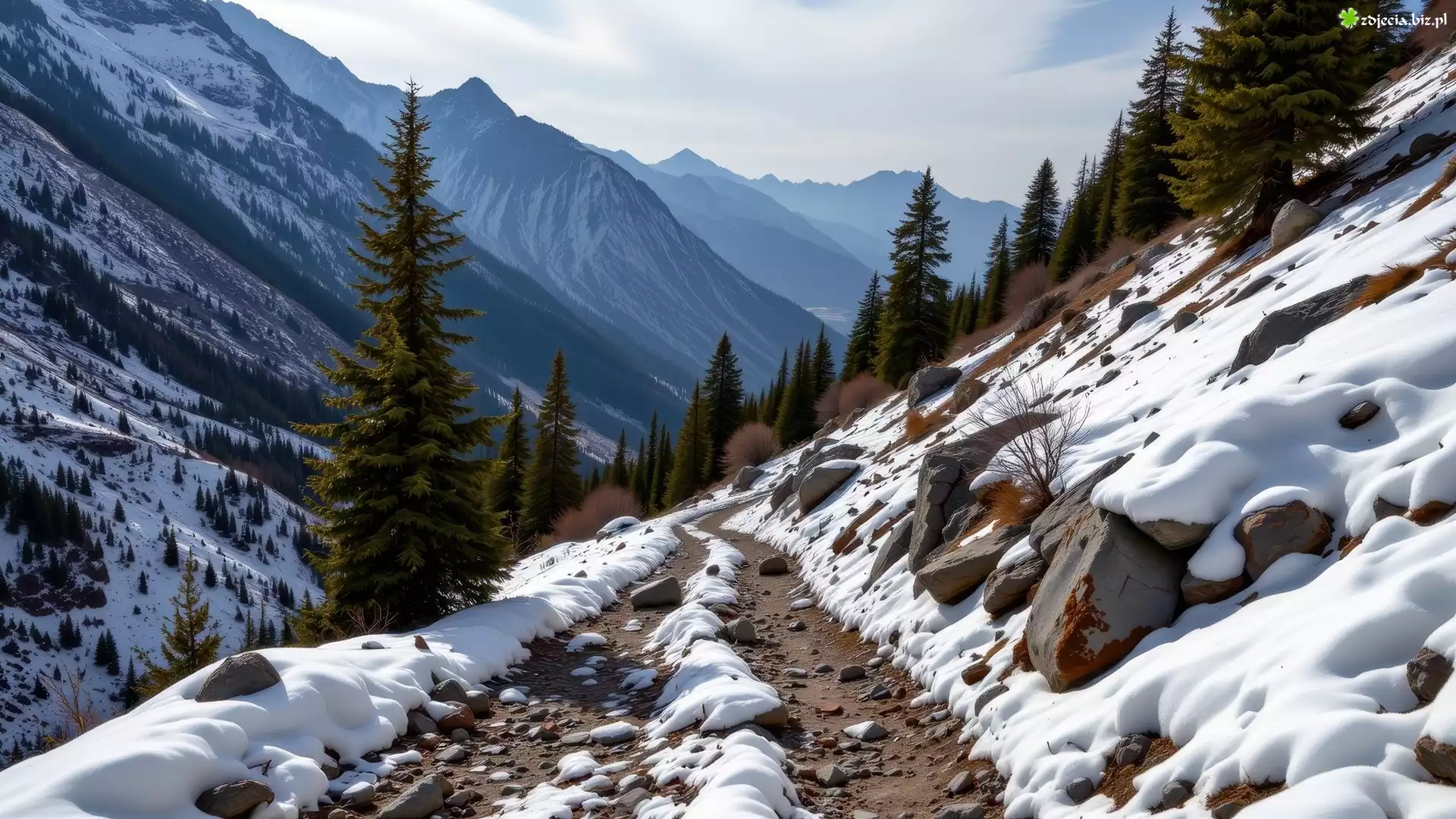 Zdjęcie Zima, Góry, Śnieg, Drzewa, Świerki, Droga, Kamienie
