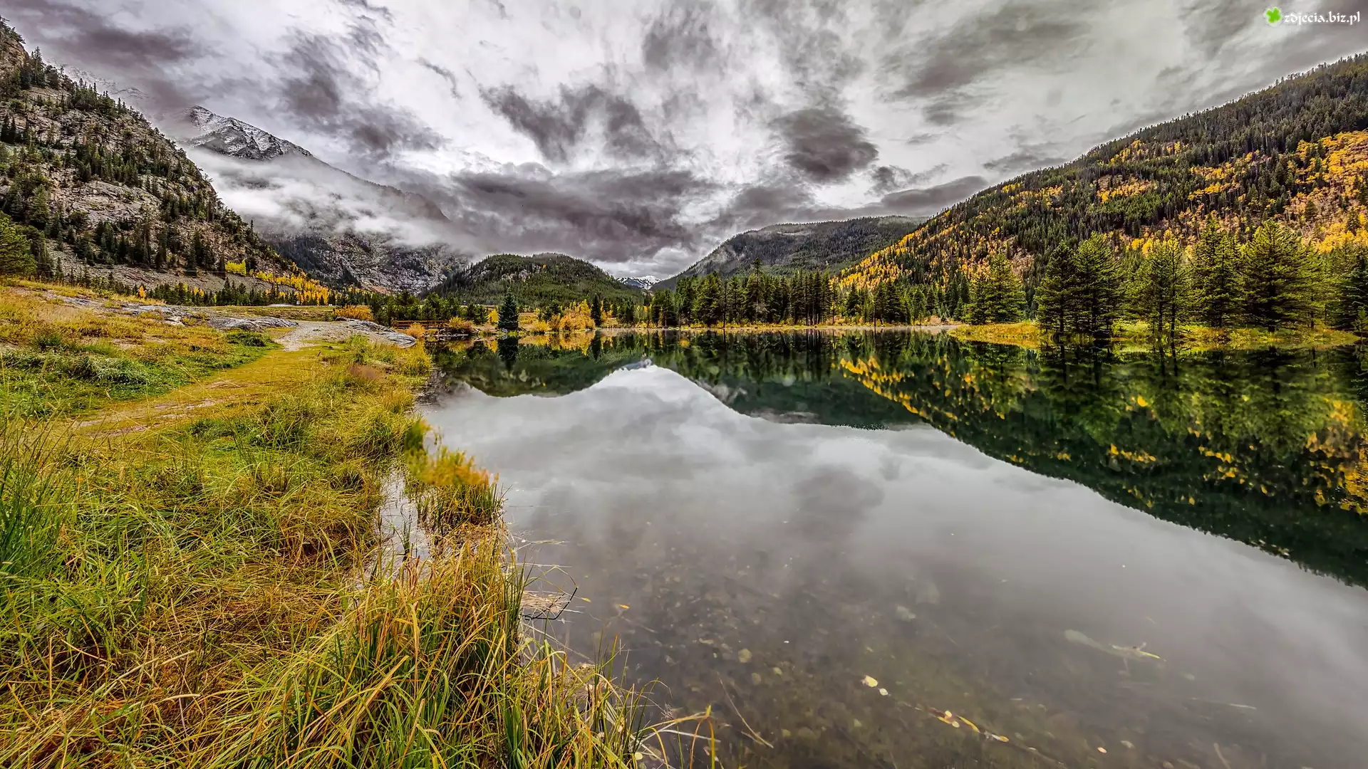 Zdjęcie Góry Skaliste, Jezioro, Officers Gulch Pond, Drzewa, Stan Kolorado, Stany Zjednoczone