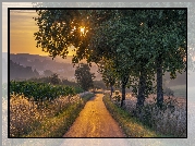 Zdjęcie Góry, Łąki, Trawa, Drzewa, Droga, Zachód słońca