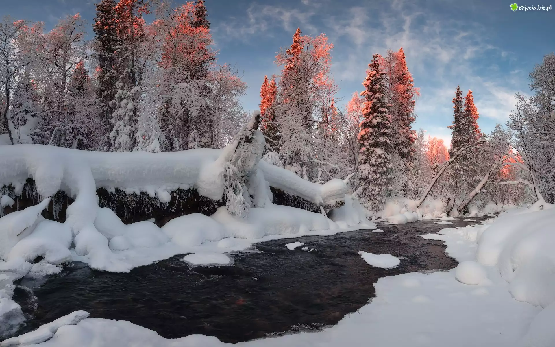 Zdjęcie Zima, Rzeka, Ośnieżone, Drzewa, Rozświetlone, Wierzchołki