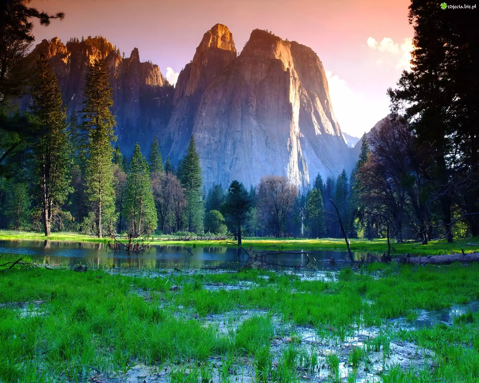 Zdjęcie Stany Zjednoczone, Stan Kalifornia, Park Narodowy Yosemite, Łąka, Woda, Góry, Drzewa
