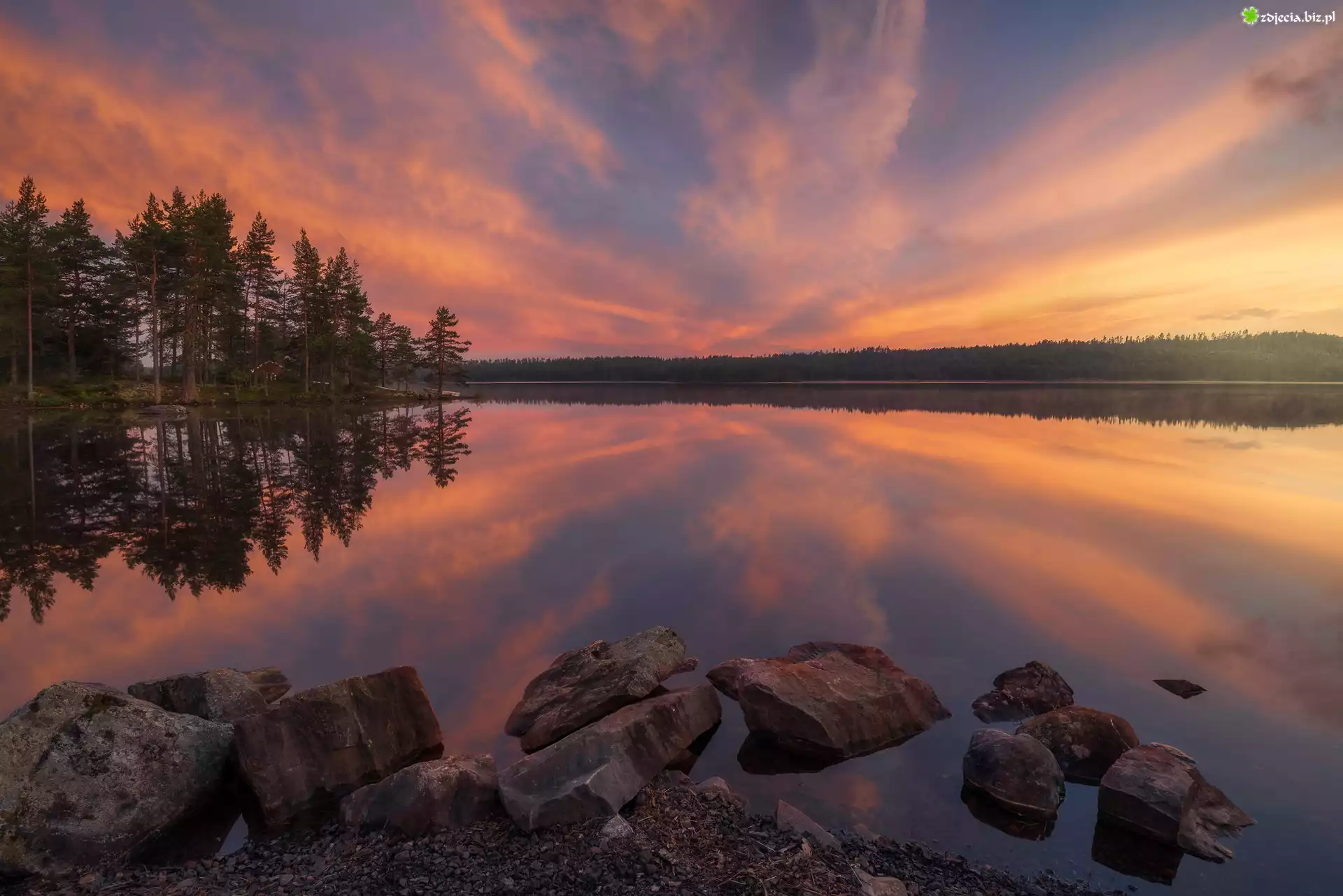 Zdjęcie Drzewa, Kamienie, Jezioro, Zachód słońca