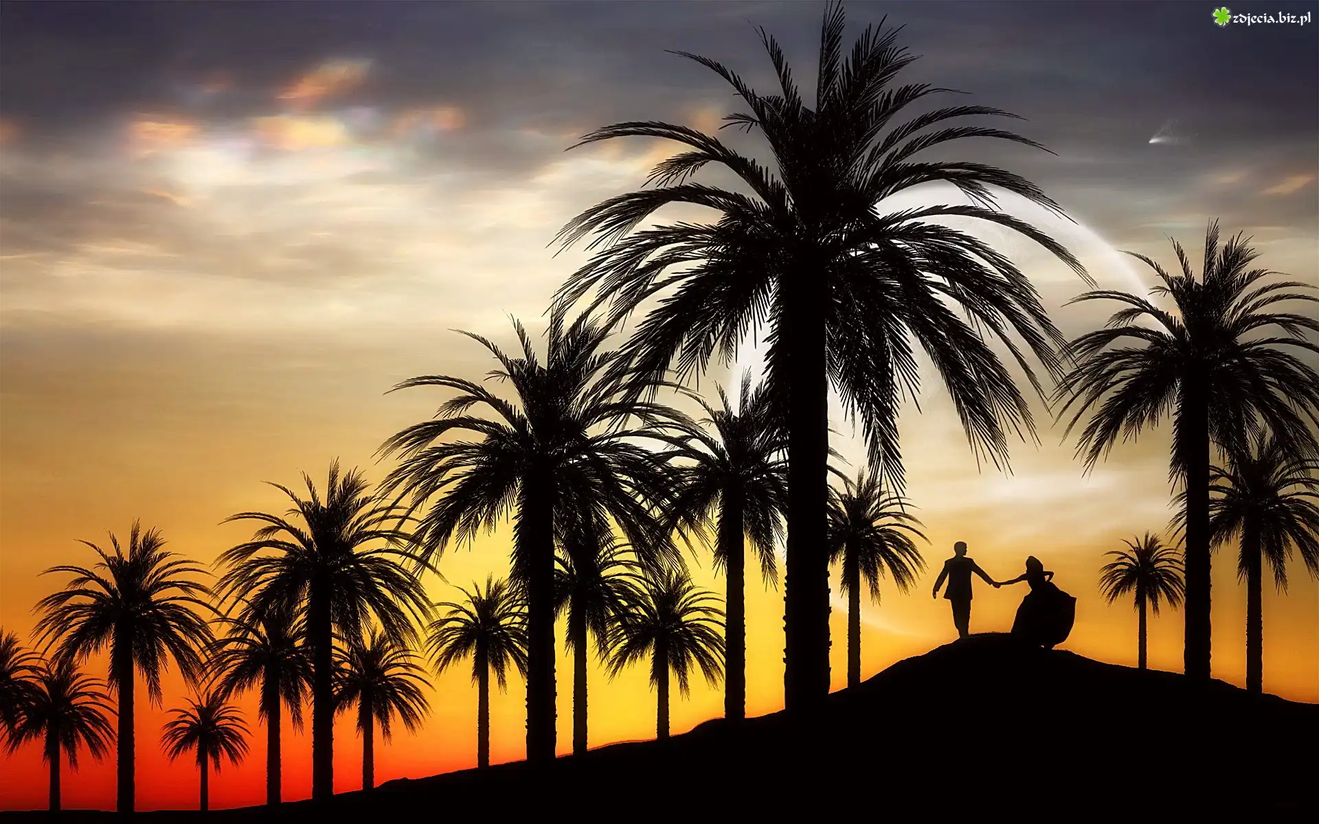 Zdjęcie Drzewa, Palmy, Para, Zachód Słońca