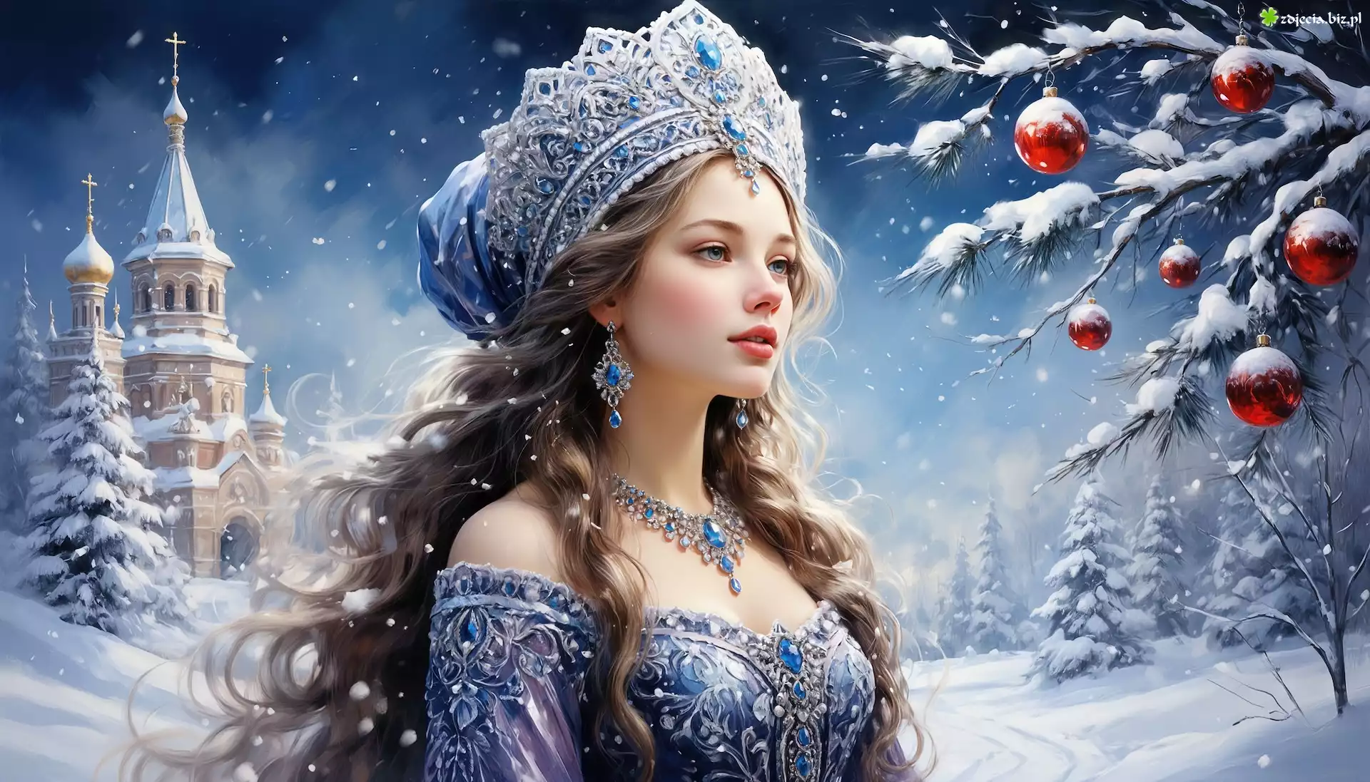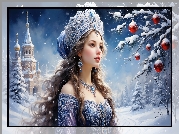 Zdjęcie Kobieta, Biżuteria, Zima, Drzewa, Ośnieżone, Bombki, Zamek