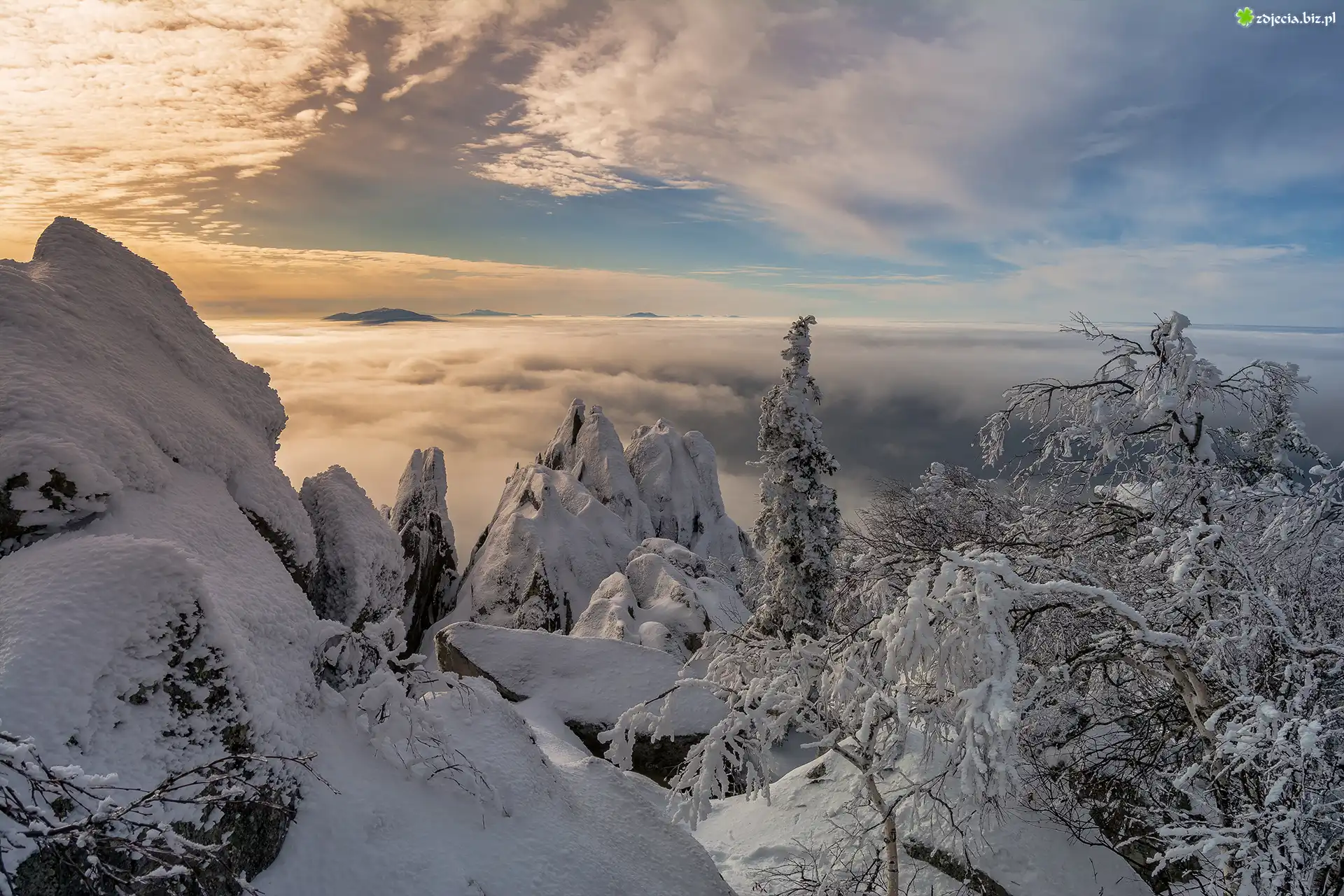 Zdjęcie Zima, Drzewa, Skały, Mgła, Chmury, Szczyty, Góry