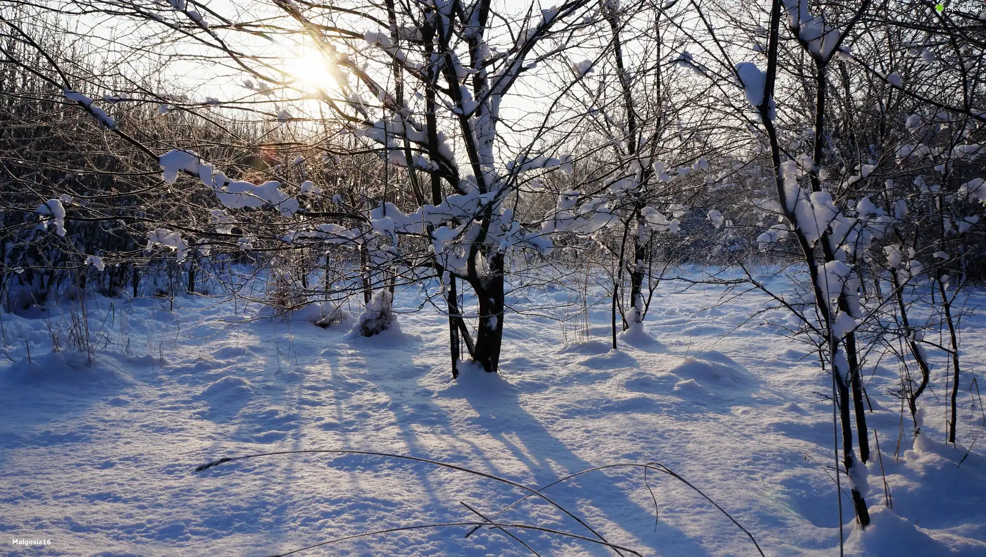 Zdjęcie Zima, Drzewa, Śnieg, Gałęzie, Przebijające Światło, Słońce