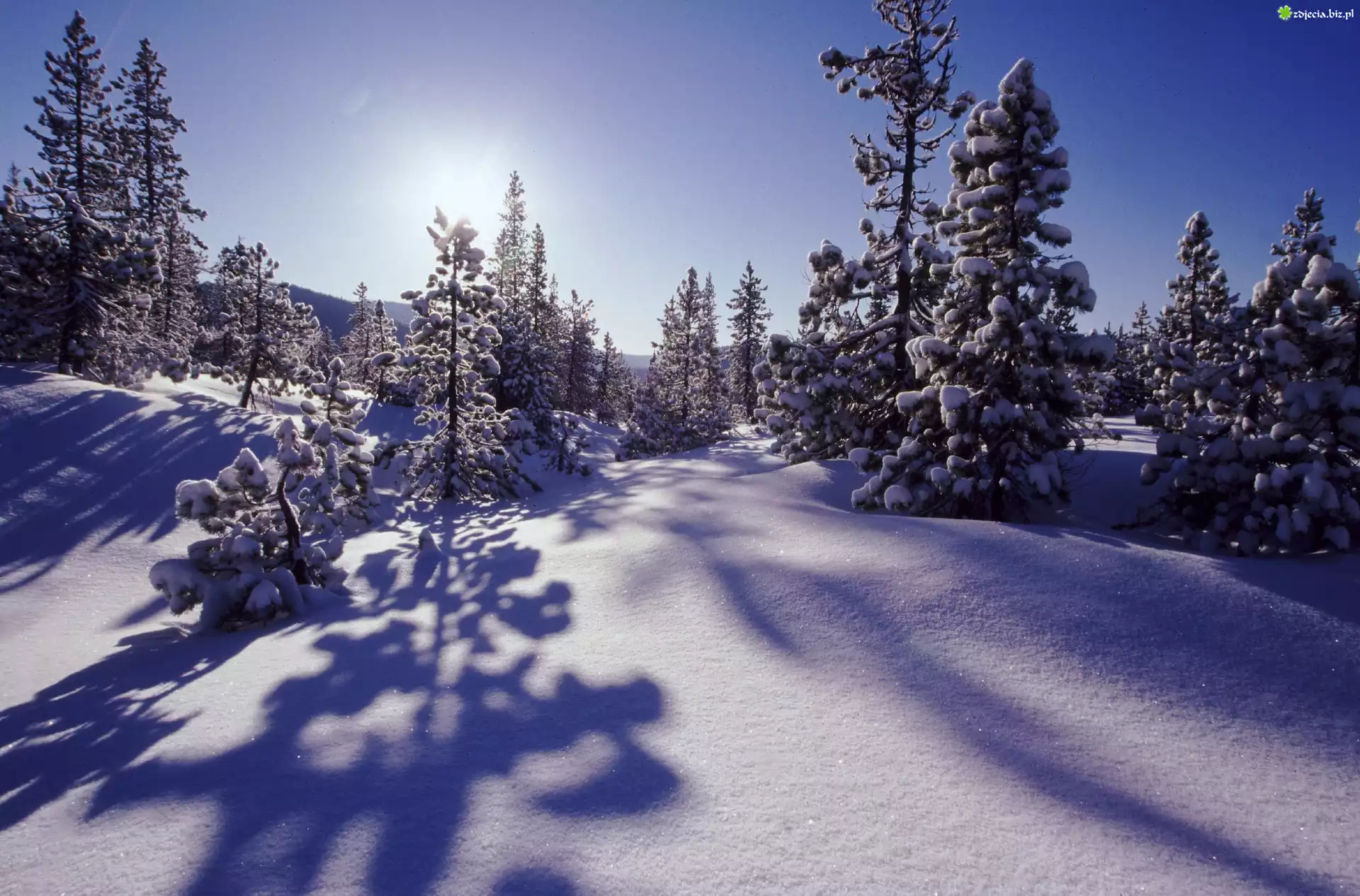 Zdjęcie, Drzewka, Pokryte, Śniegiem, Promienie, Słońca
