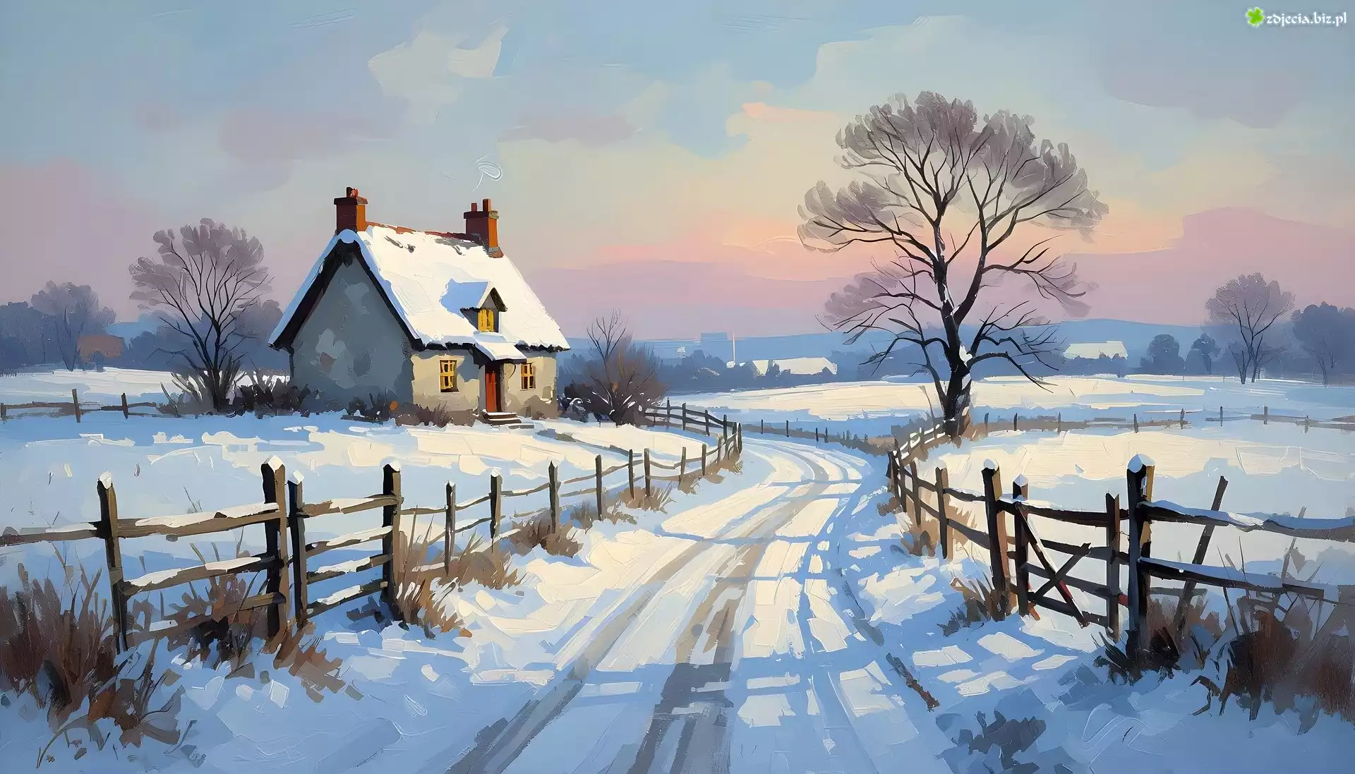Zdjęcie Zima, Drzewo, Dom, Ogrodzenie, Droga