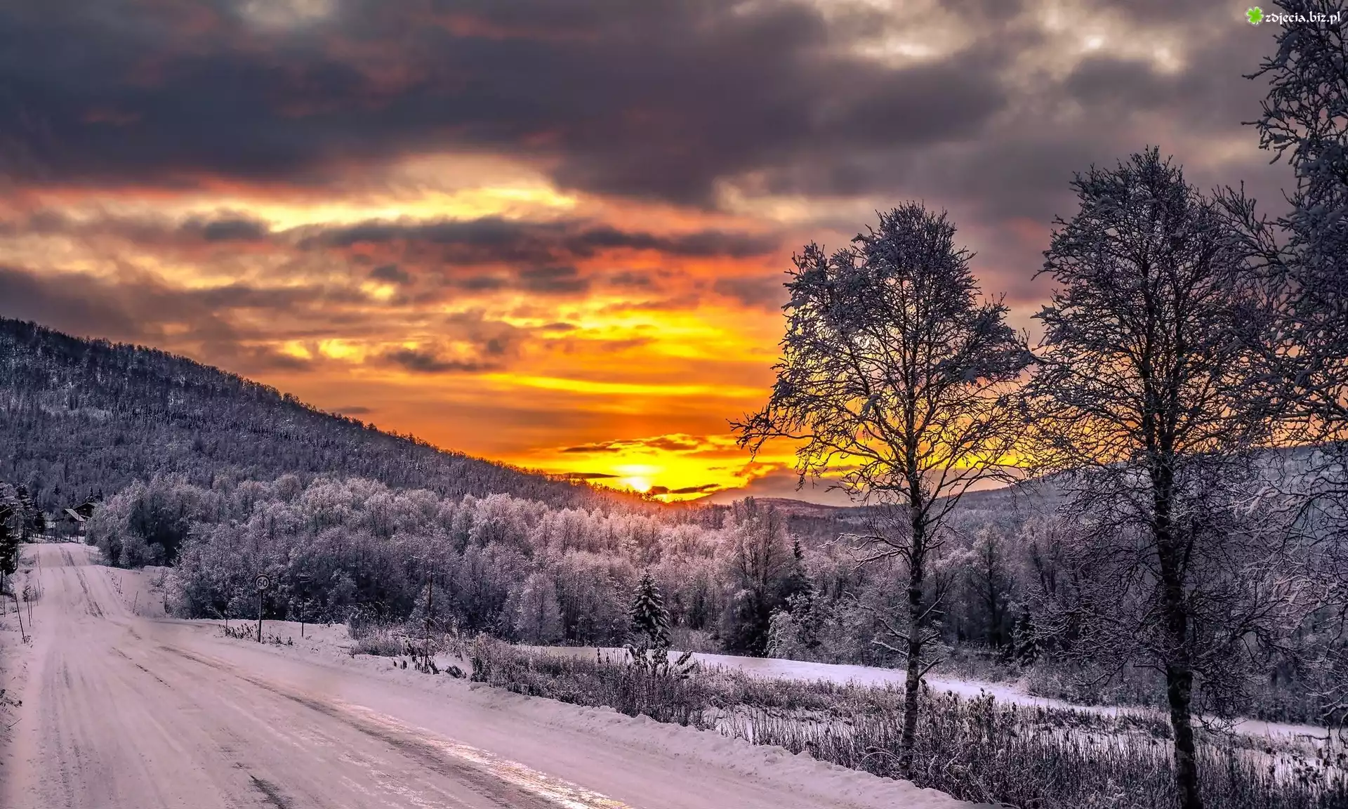 Zdjęcie Norwegia, Wyspa Senja, Droga, Góry, Lasy, Zachód słońca, Zima, Drzewo