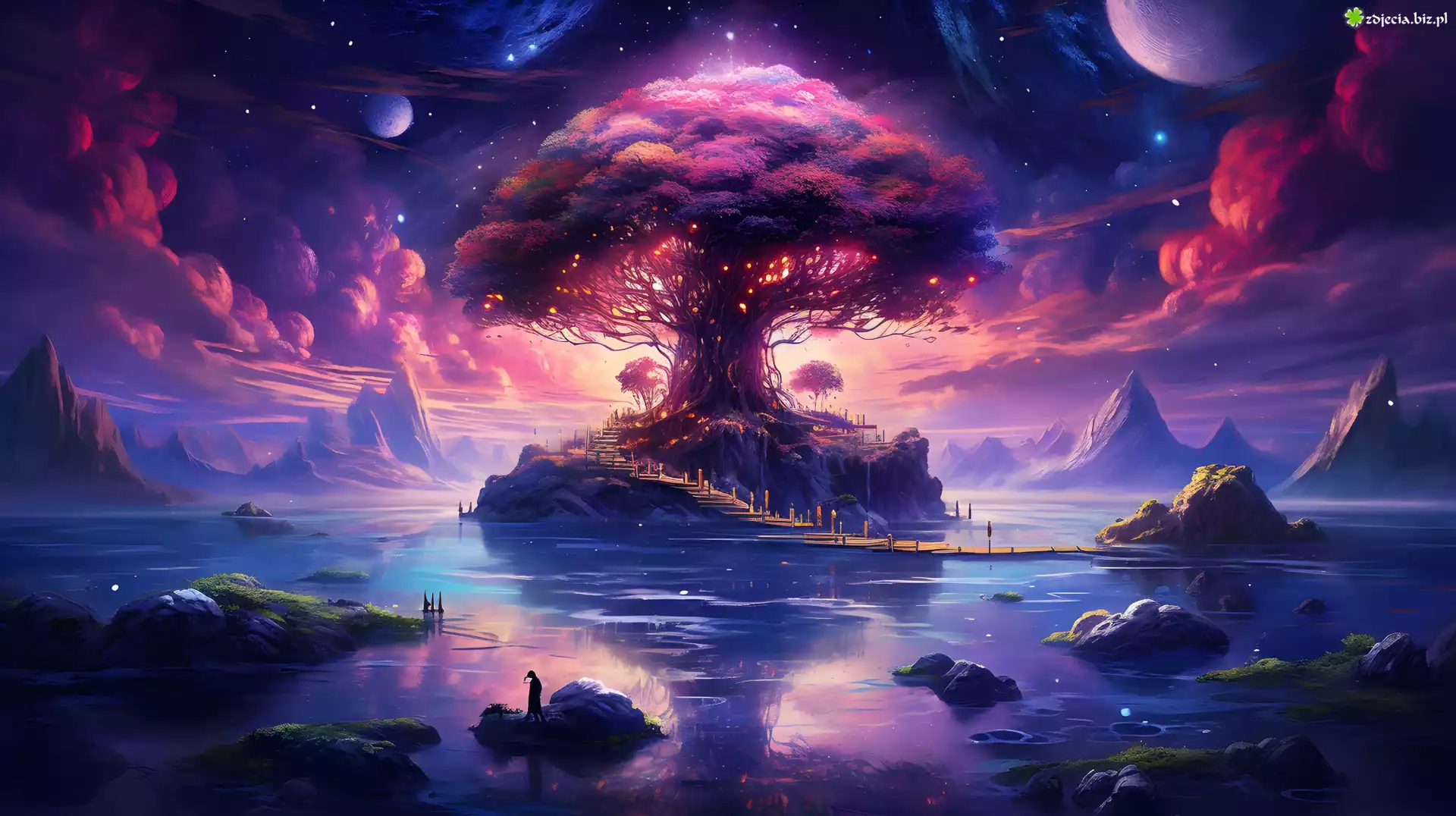 Zdjęcie Drzewo, Wyspa, Jezioro, Góry, Niebo, Chmury, Planety, Gwiazdy, Grafika Fantasy