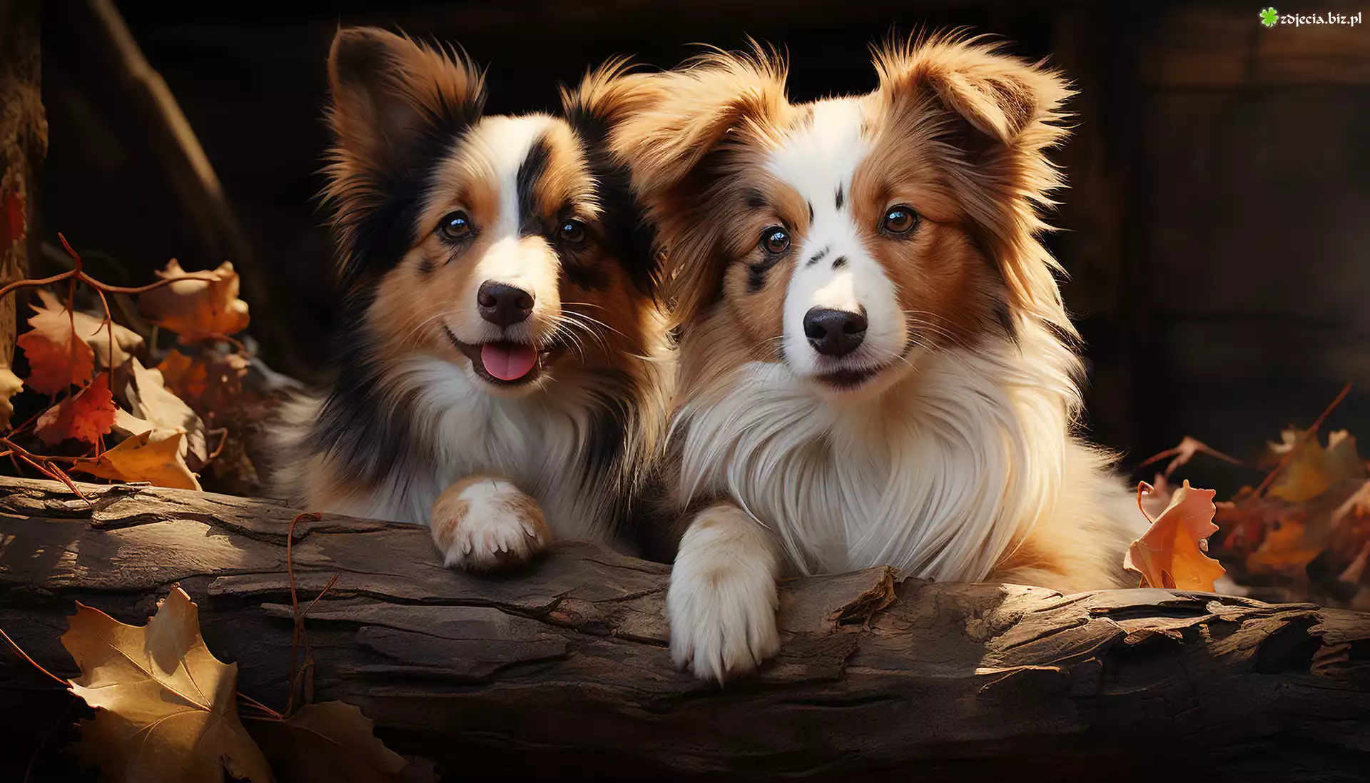 Zdjęcie Dwa, Psy, Kłoda, Drzewo, Liście, Jesień, Grafika