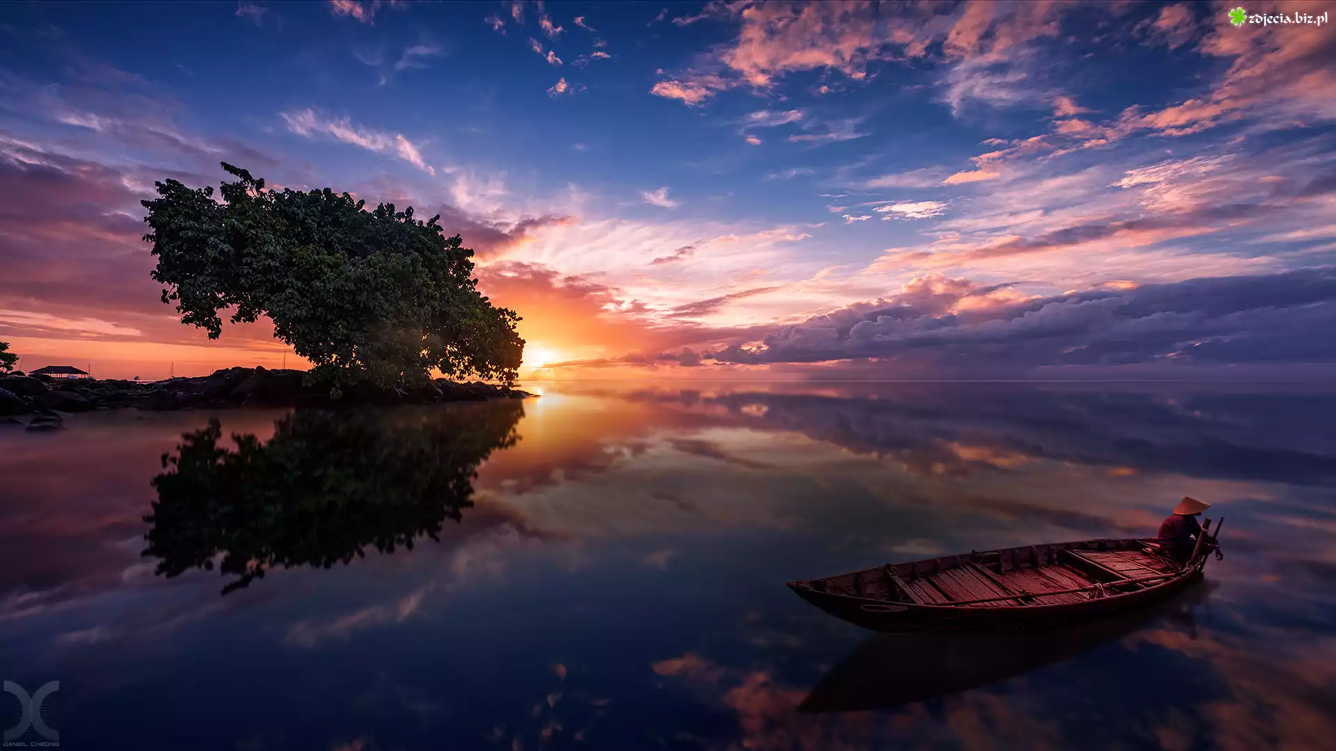 Zdjęcie Zachód słońca, Jezioro, Drzewo, Łódka, Mężczyzna
