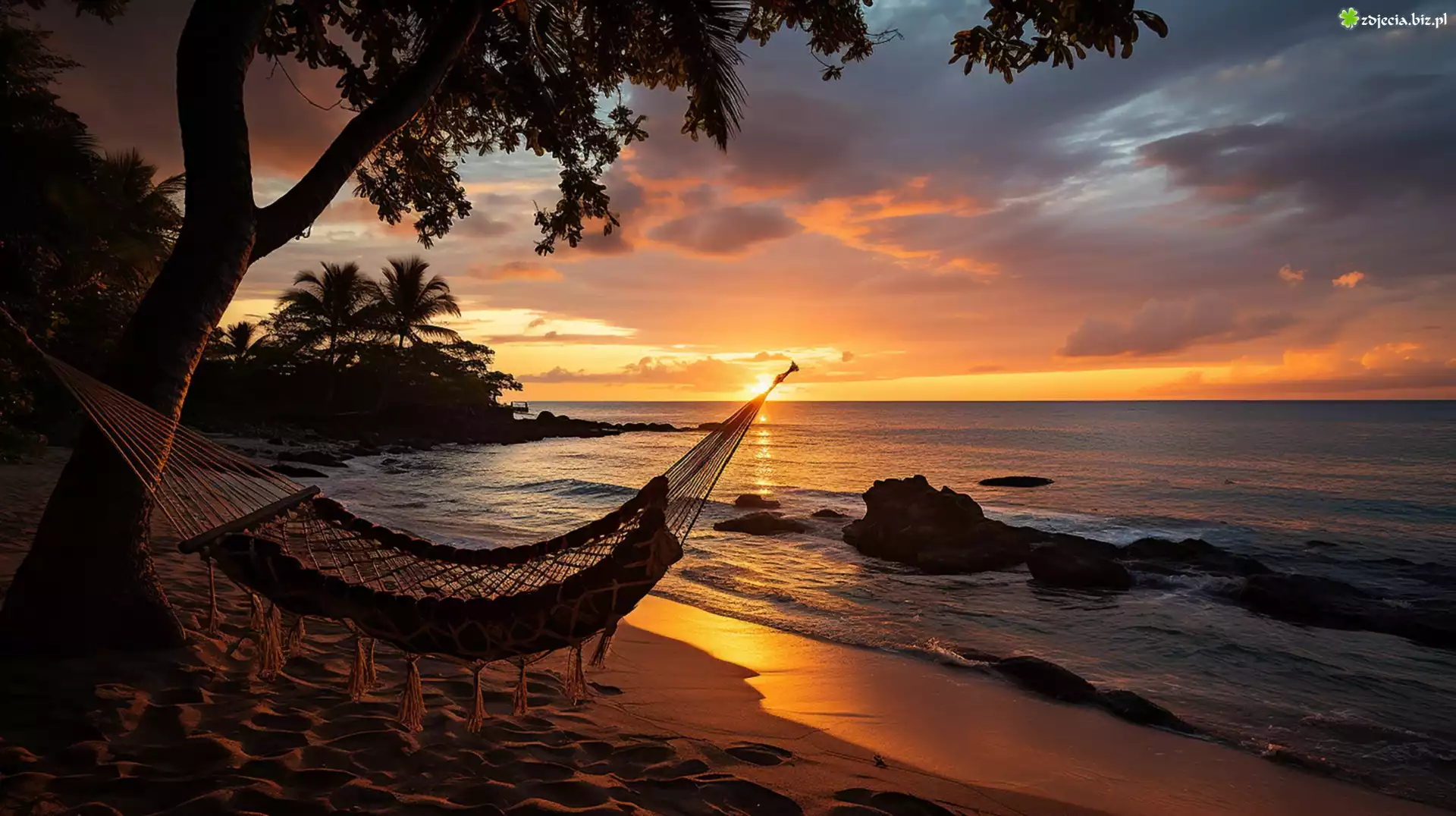 Zdjęcie Morze, Zachód słońca, Drzewo, Hamak, Plaża