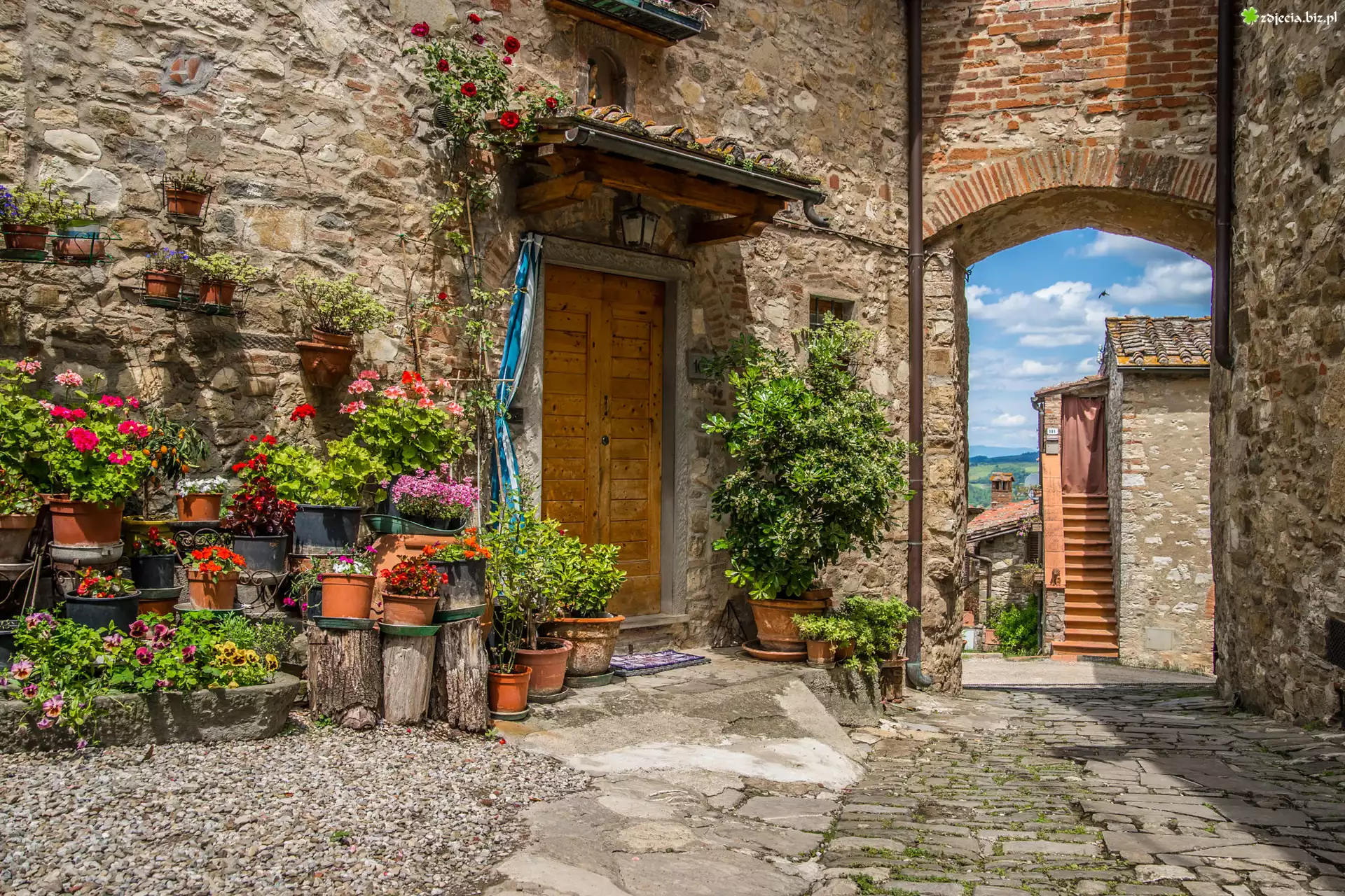 Zdjęcie Dom, Drzwi, Mury, Donice, Kwiaty