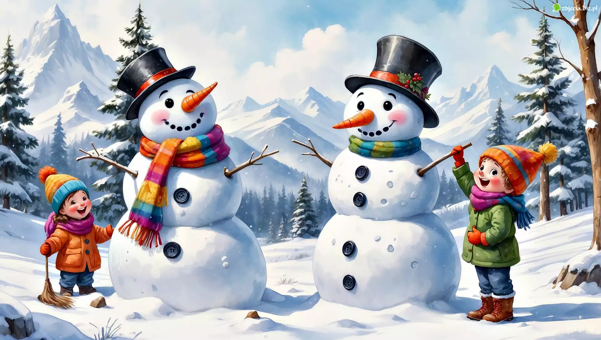 Zdjęcie Zima, Dwa, Bałwany, Dzieci, Grafika