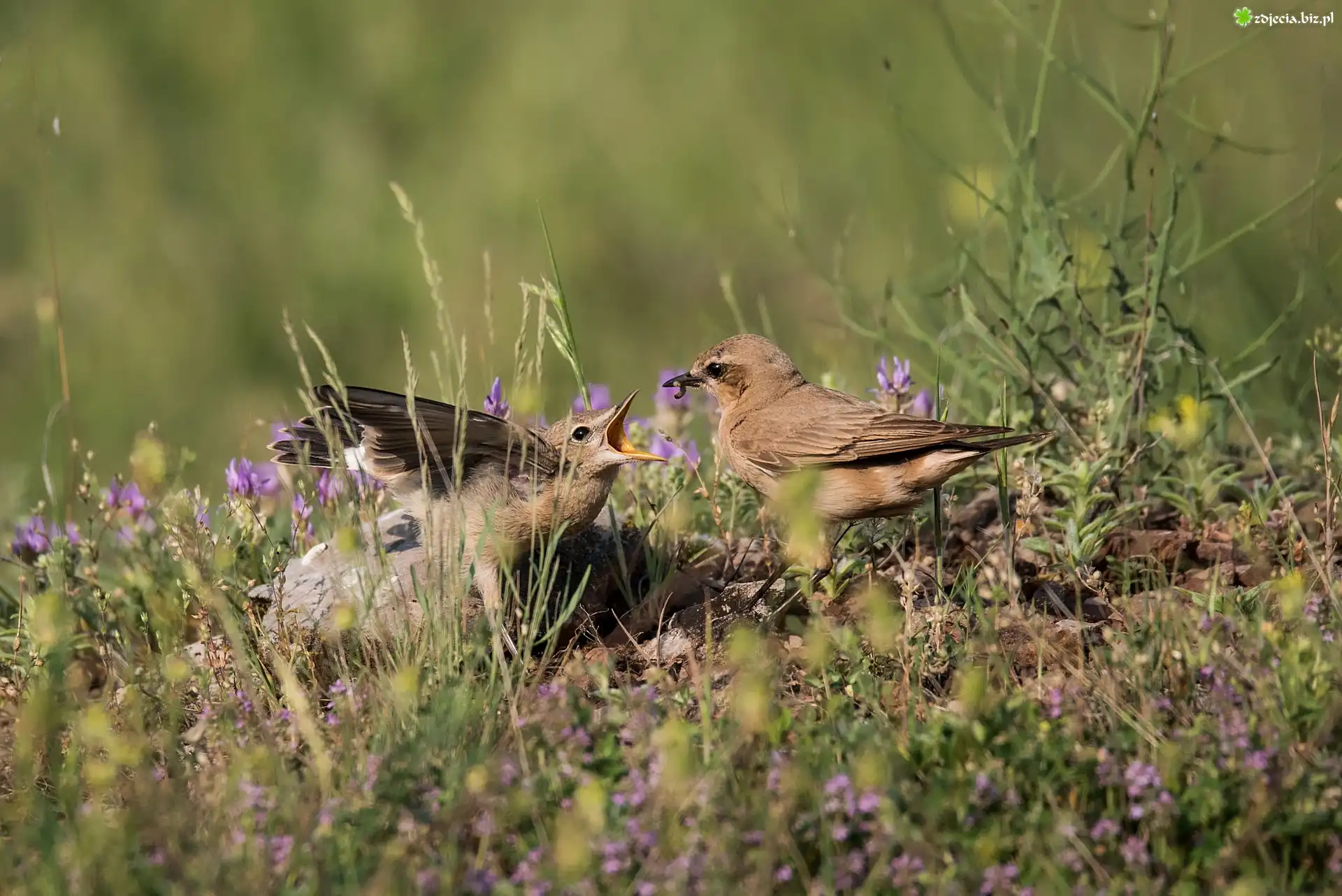 Zdjęcie, Dwa, Ptaki, Białorzytki płowe, Karmienie, Trawa