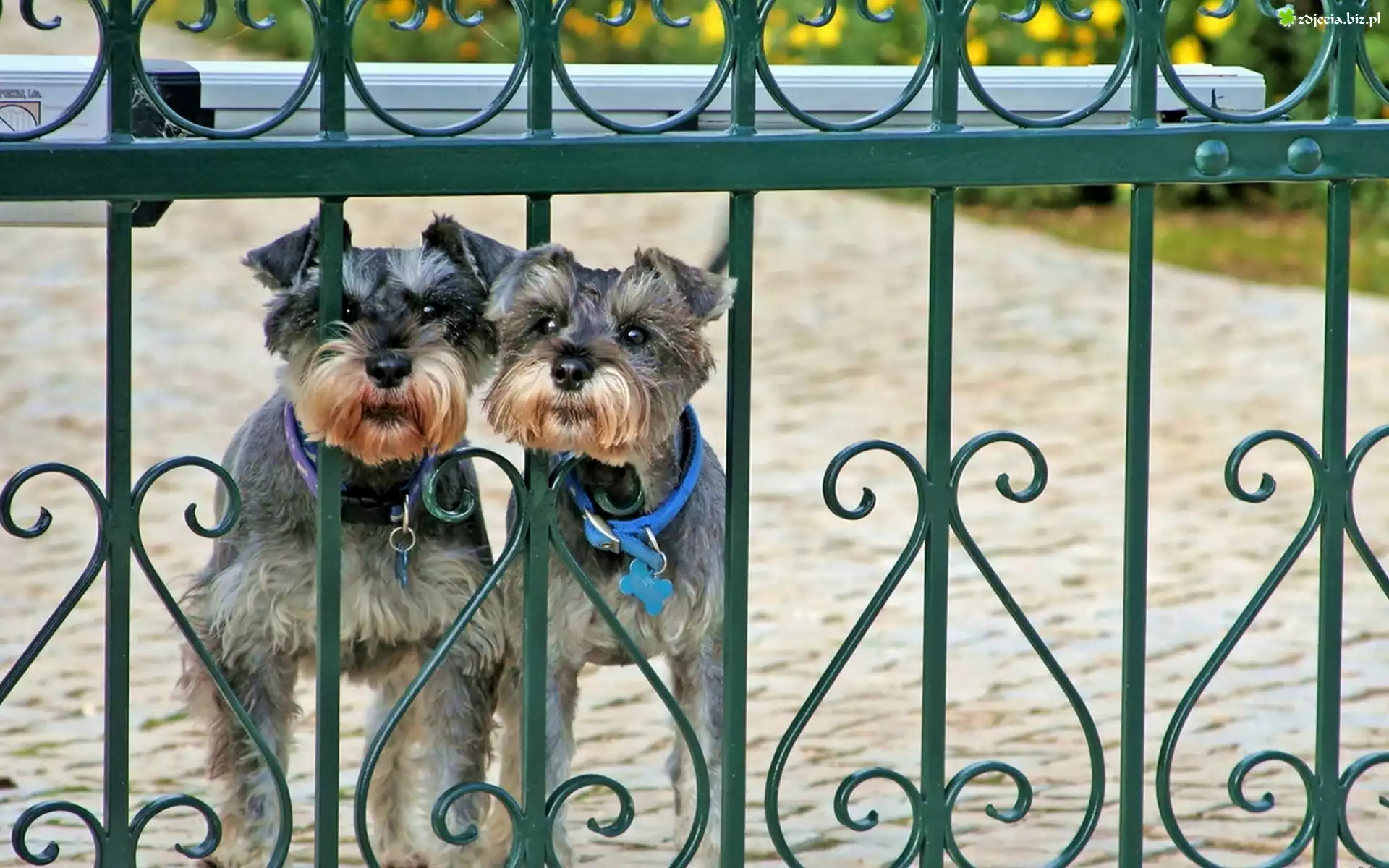 Zdjęcie Dwa, Psy, Sznaucery, Miniaturka, Ogrodzenie