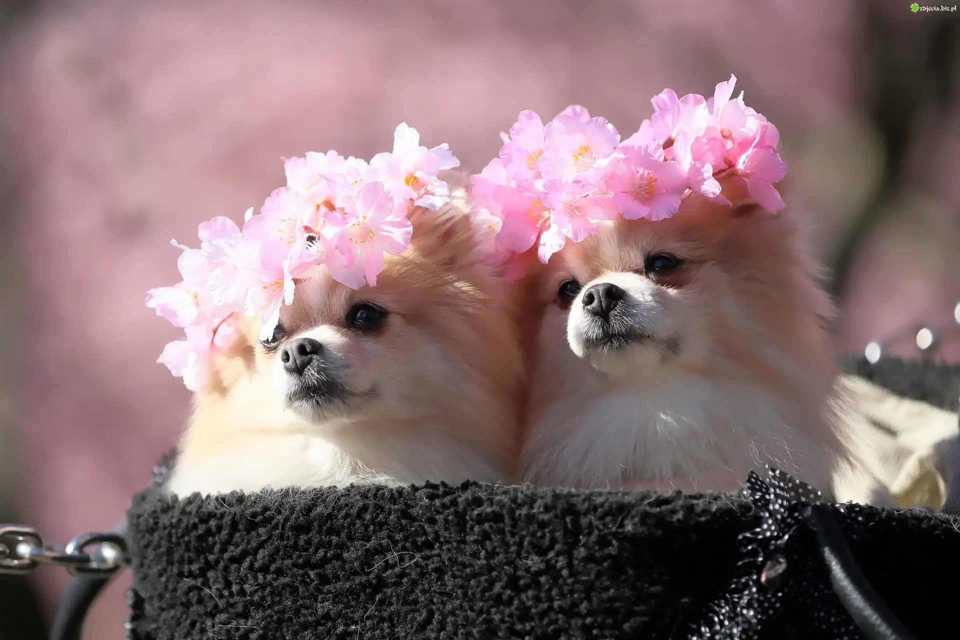 Zdjęcie Dwa, Psy, Szpice miniaturowe, Wianki