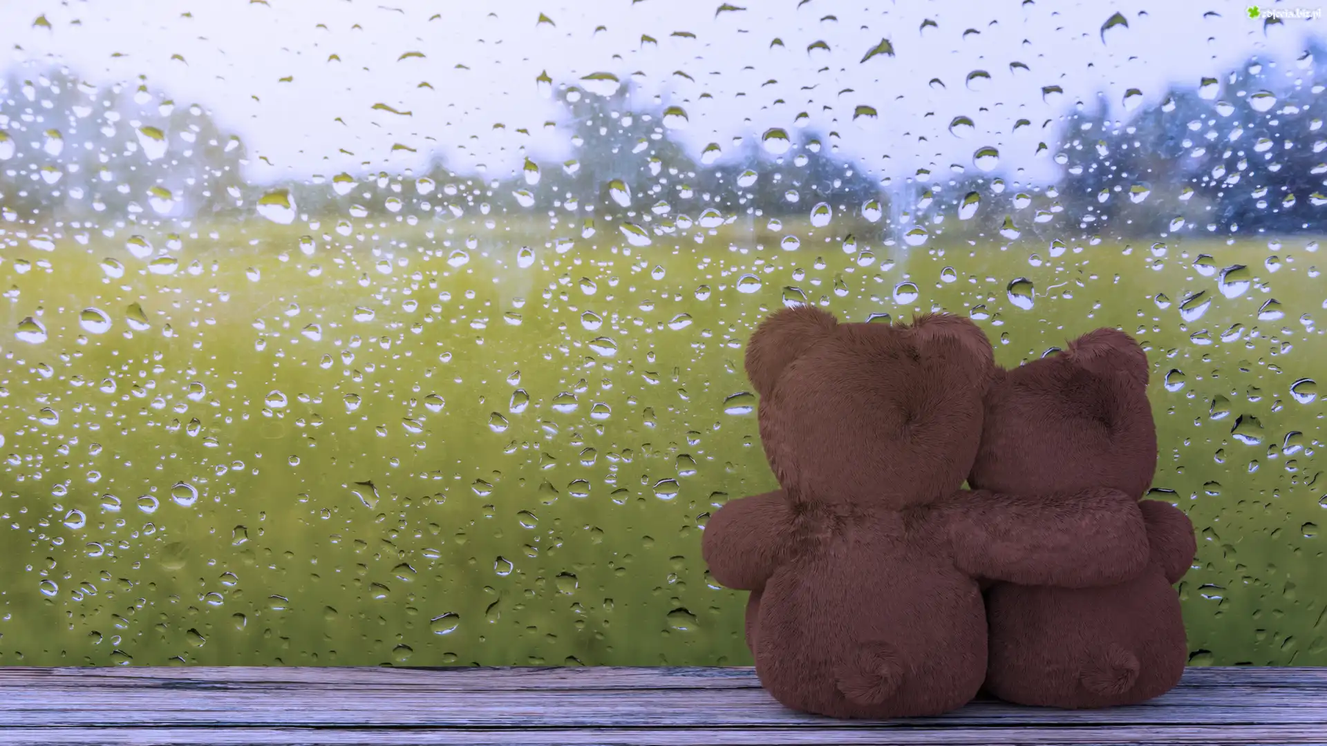 Zdjęcie Dwa, Przytulone, Pluszowe, Misie, Okno, Deszcz