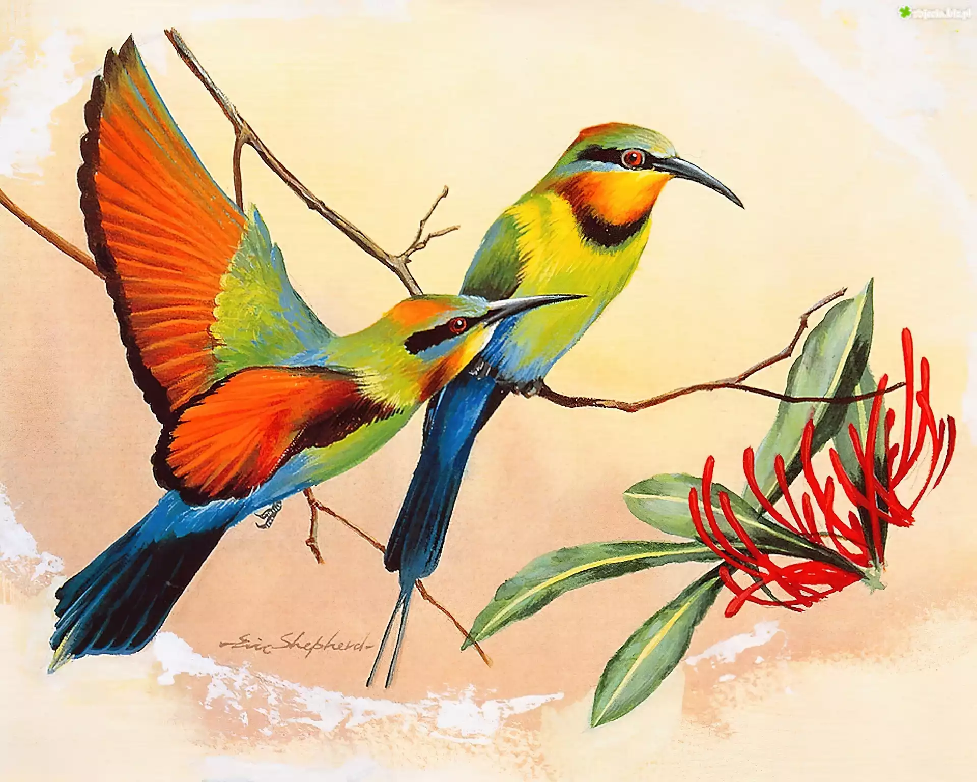 Zdjęcie Dwa, Kolorowe, Ptaki, Gałązka