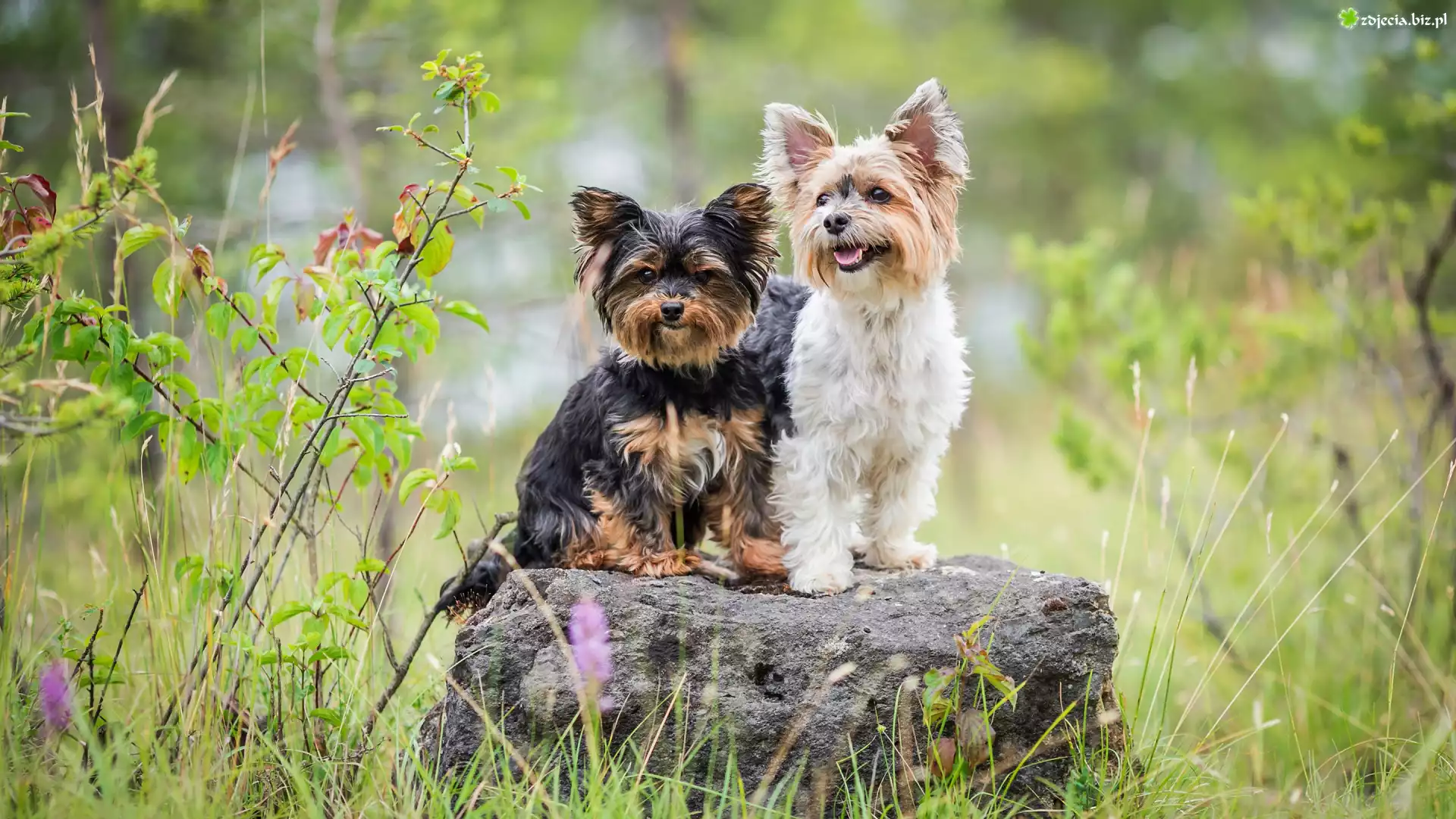 Zdjęcie Dwa, Psy, Yorkshire terrier, Kamień